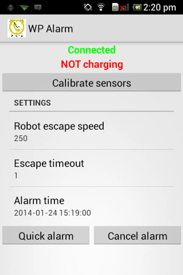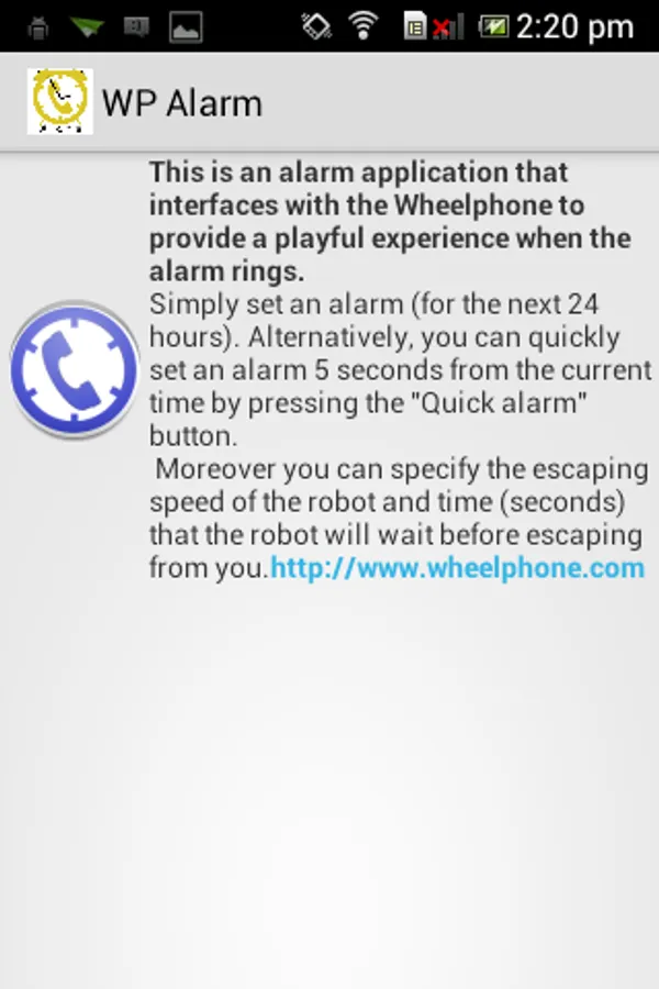 More information about this application, how to use it and the source code are available in the Wheelphone wiki http://www.gctronic.com/doc/index.php/Android_software#Wheelphone_Alarm.