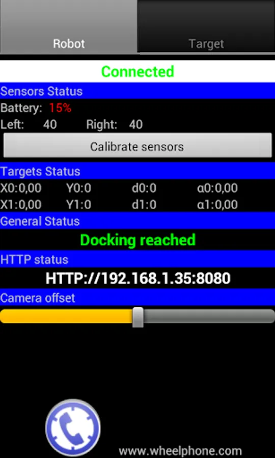 More information about this application, how to use it and the source code are available in the Wheelphone wiki http://www.gctronic.com/doc/index.php/Android_software#Wheelphone_target_docking.
