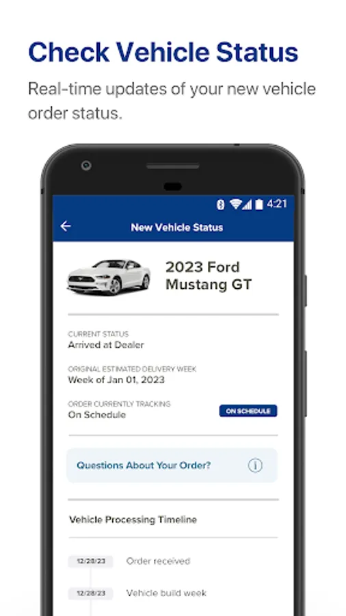 • Vehicle Order Status - receive order status and vehicle pick-up instructions. NEW: confirm you have taken delivery of your new vehicle