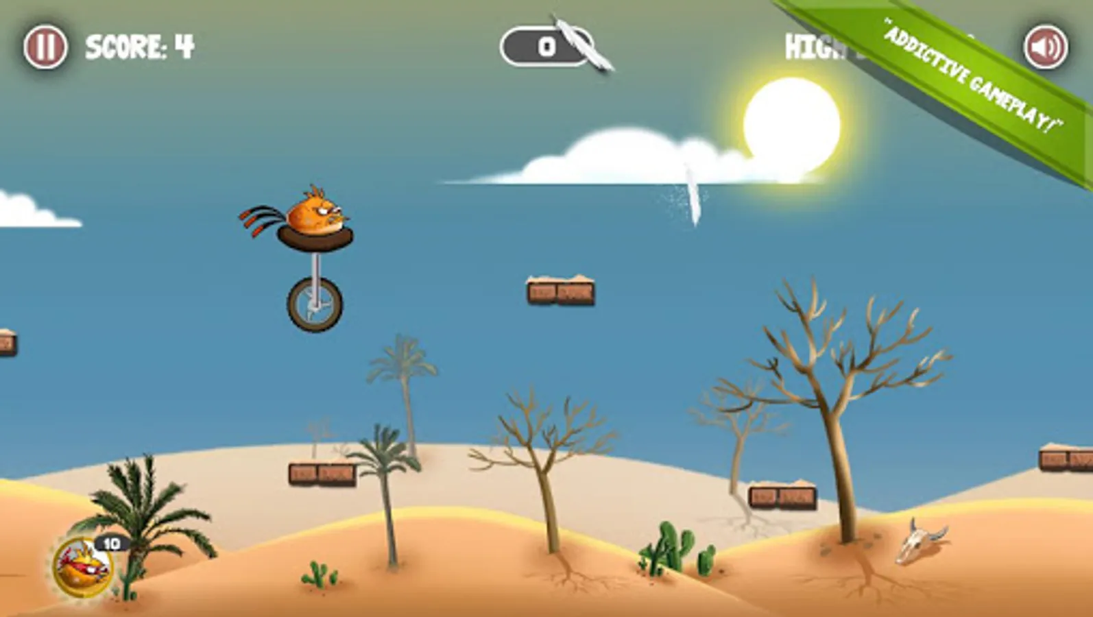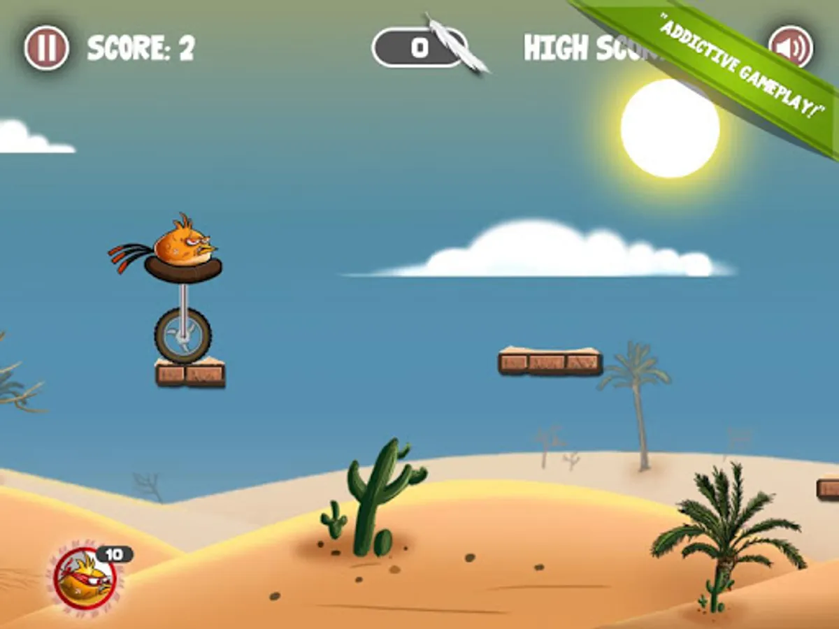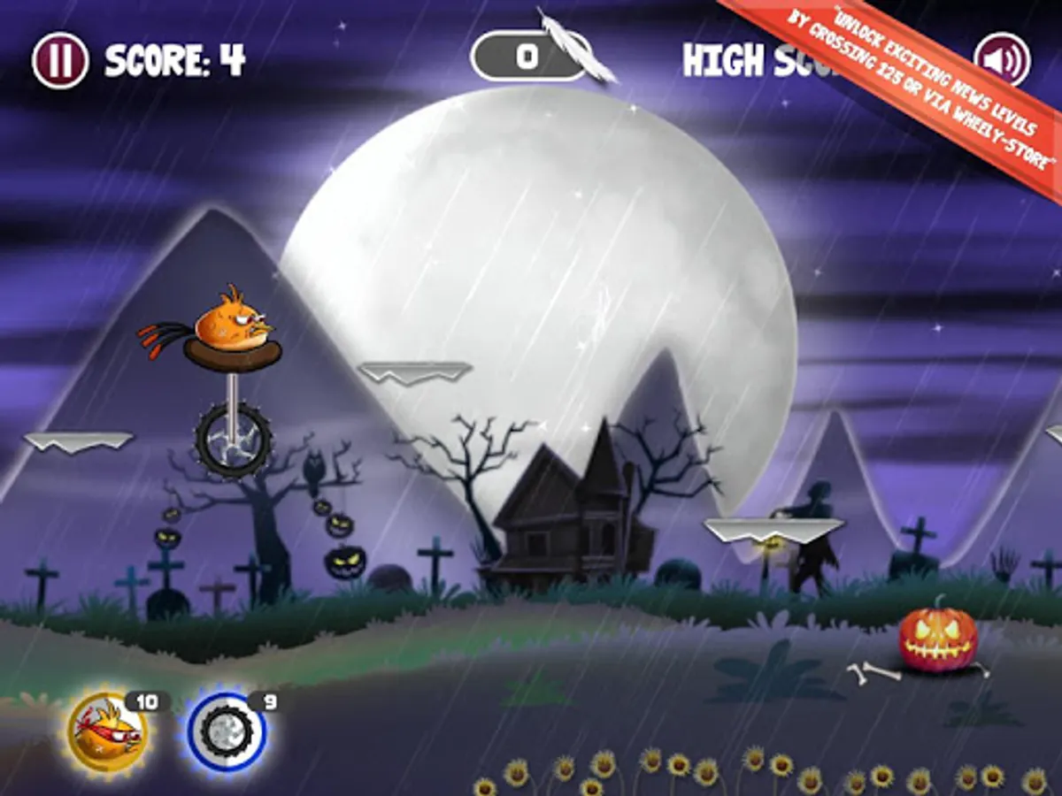 An ancient curse has taken away Wheelie Bird's wings and its ability to fly. Play through three different fun and engaging levels to break the ancient curse. Unlock new levels by reaching a score of 100.