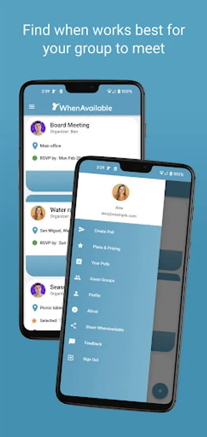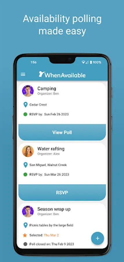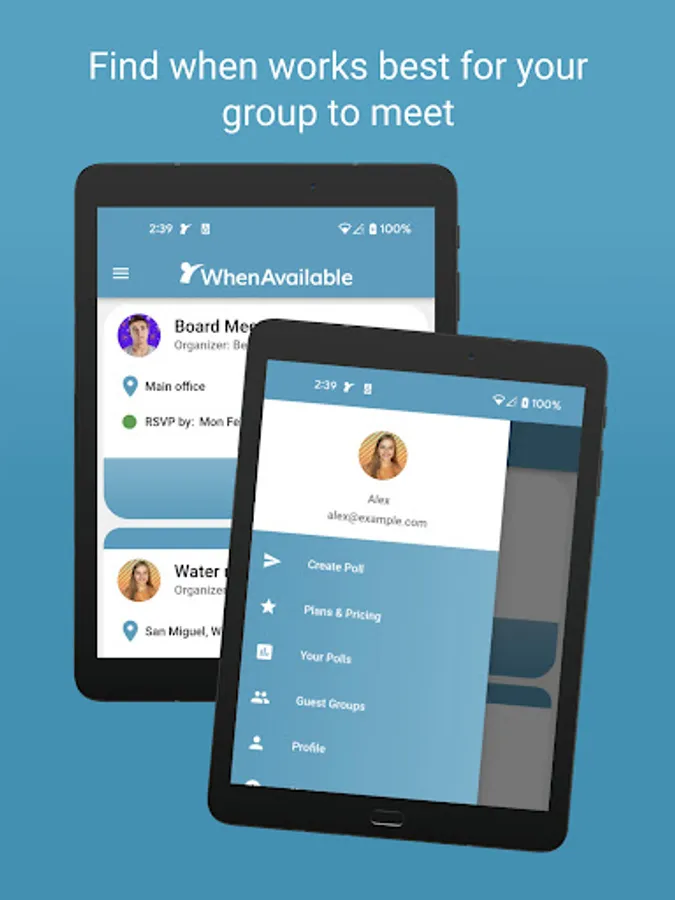 WhenAvailable helps you schedule your event based on when everyone can be there. Whether it is a dinner party, board meeting, or a guys' night out, the app makes it easy to find when works best for the group.