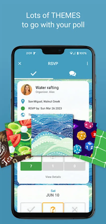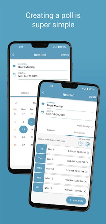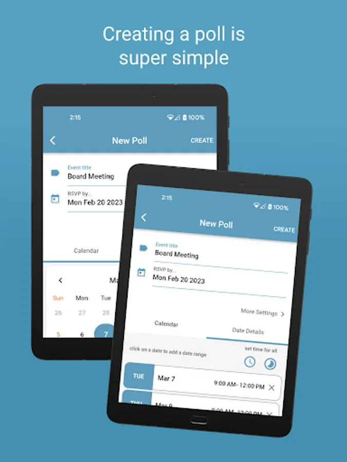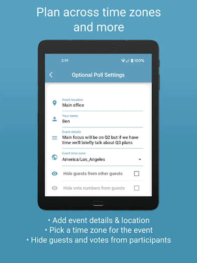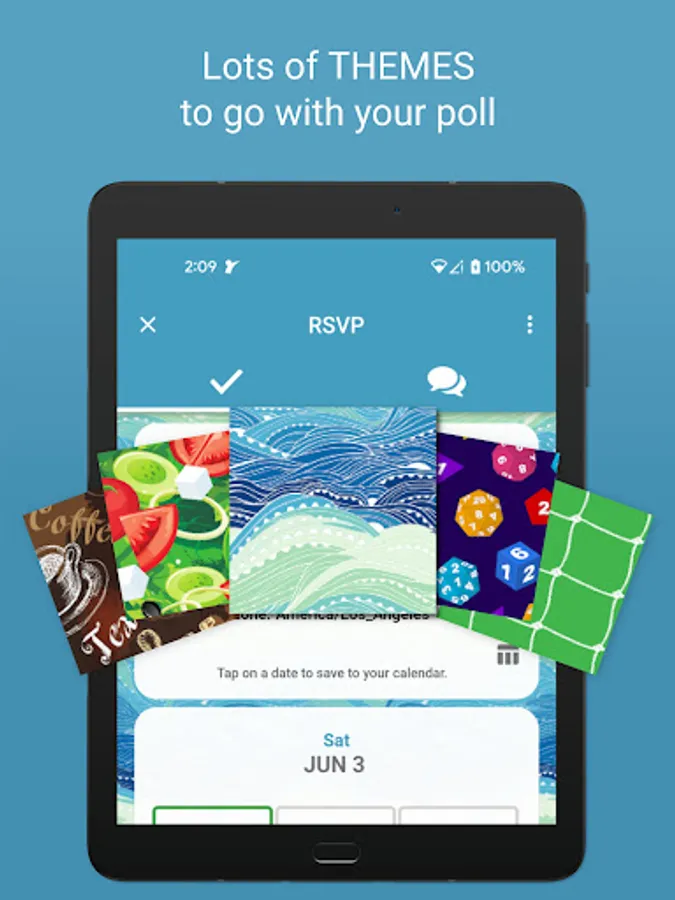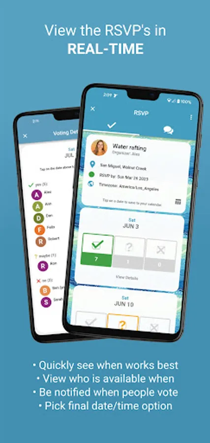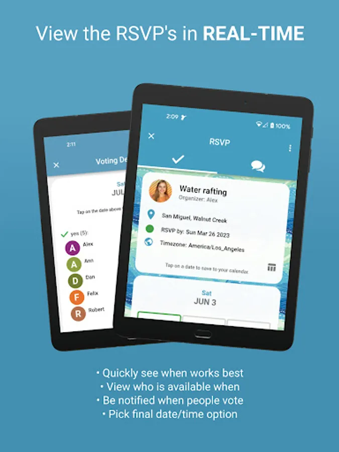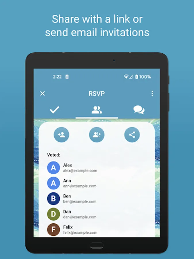 Simply select dates and times you want to suggest for your event and then either send invitation emails to your guests through the app or copy a link to share with your guests on social media or via text messaging.