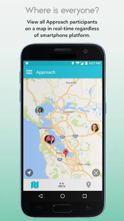 The map view allows you to see each participant's profile image and location in real-time. Everyone stays informed of arrival times without having to use unsafe text messages while driving. Approach can be used in many scenarios such as meeting people at a restaurant, driving home from work or vacation, tracking family members on a long journey, and monitoring kids on a field trip.