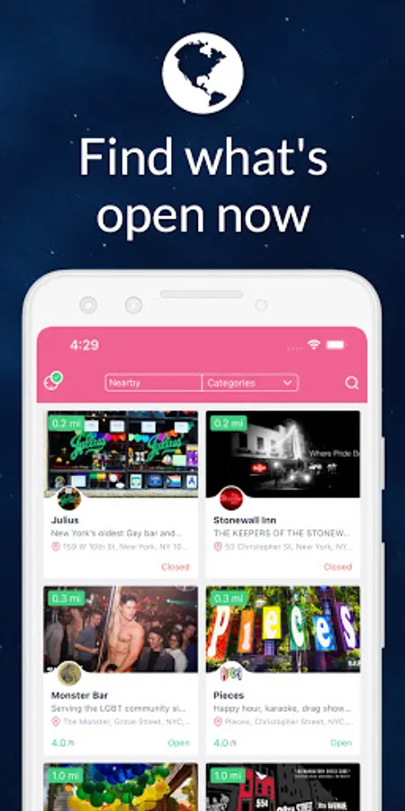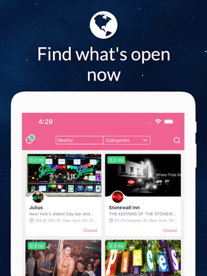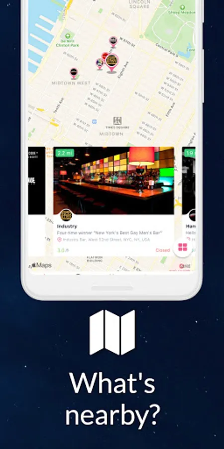 Find your nearest gay venues by distance (location permission required) or on our city maps. Cities include London, NYC, Sydney, Chicago, Los Angeles, Melbourne, Singapore, Bangkok, Toronto and more.