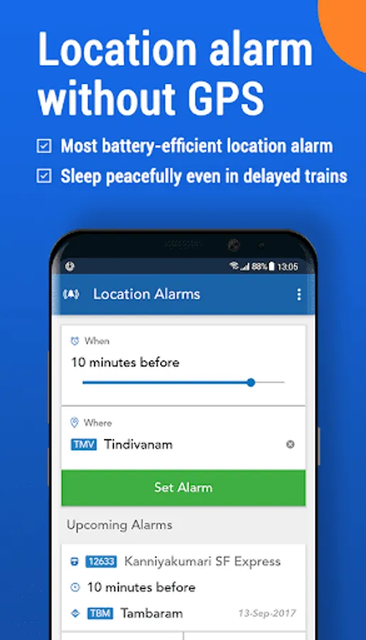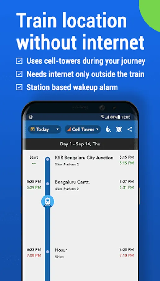 Get live train status of Indian Railways anytime, anywhere. When you are traveling on a train, this feature can work without internet or GPS as it uses cell tower information to find the location. You can share current train location with your friends & family via the share feature. You can also set an alarm to wake you up at a fixed time before your railway station arrives.