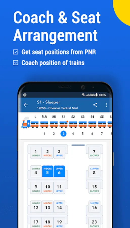 Get information on coach position and seat/berth layout before you board the train. Also shows platform numbers for boarding and intermediate stations wherever available.