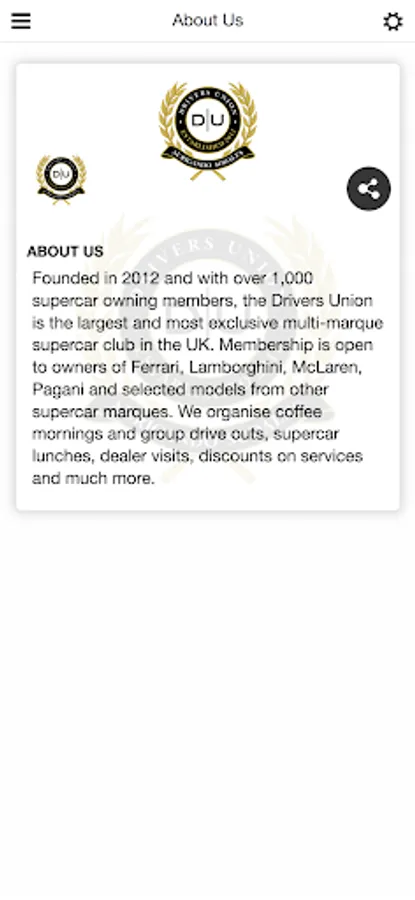 Founded in 2012, but with a heritage going back to 2005, the Drivers Union is the most exclusive multi marque supercar club in the UK. Membership is open to owners of Ferrari, Lamborghini, McLaren, Pagani and selected models from other supercar marques. We organise coffeee mornings and group drive outs, supercar lunches, dealer visits, discounts on services and much more. Download our app to stay up to date with all the latest events and news.
