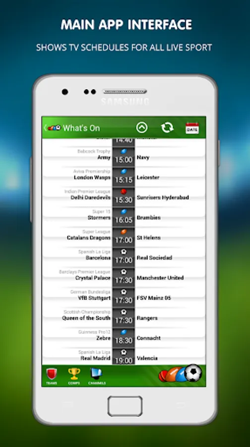 In addition to having access to all of the Live Football on TV, our amazing App also gives you an EXTRA BONUS! We cover the TV Schedules from the three other major sports in the UK – Rugby Union, Rugby League & Cricket, including competitions such as: