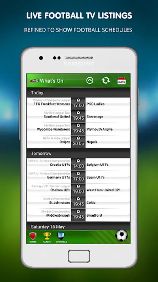 For all of you armchair football fans, our Android App gives you access to Live Football on TV Schedules from all of the main broadcasters in the UK including Sky Sports, TNT Sports (the new name for BT Sport), Viaplay Sports, BBC, ITV, Channel 4, Amazon Prime, Eurosport and all other major TV Channels.