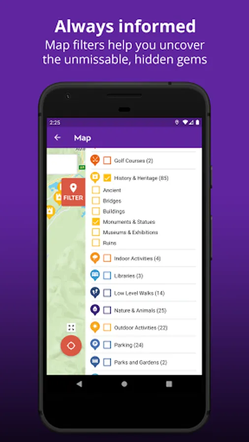 Tailor your trip - Powerful map filters let you tailor your trip, whether you want to discover a hidden gem, find a scenic view, natural wonder or historic building. Or even just the closest car park!