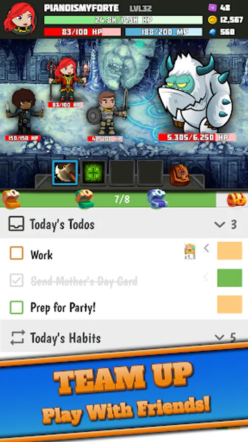 Join quests with friends together, heal, protect, and buff each other. Remember, missed tasks or habits might harm your companions!