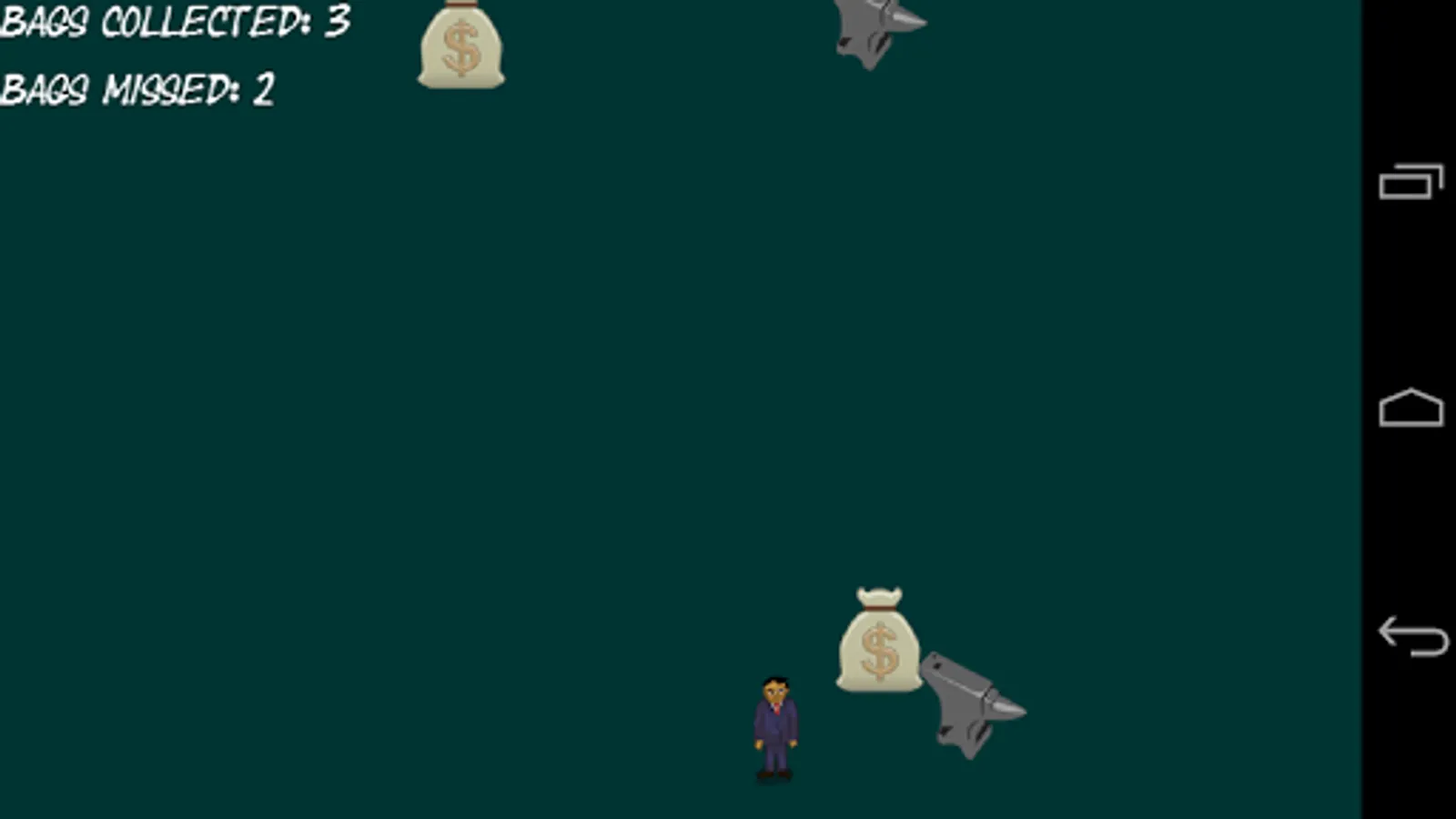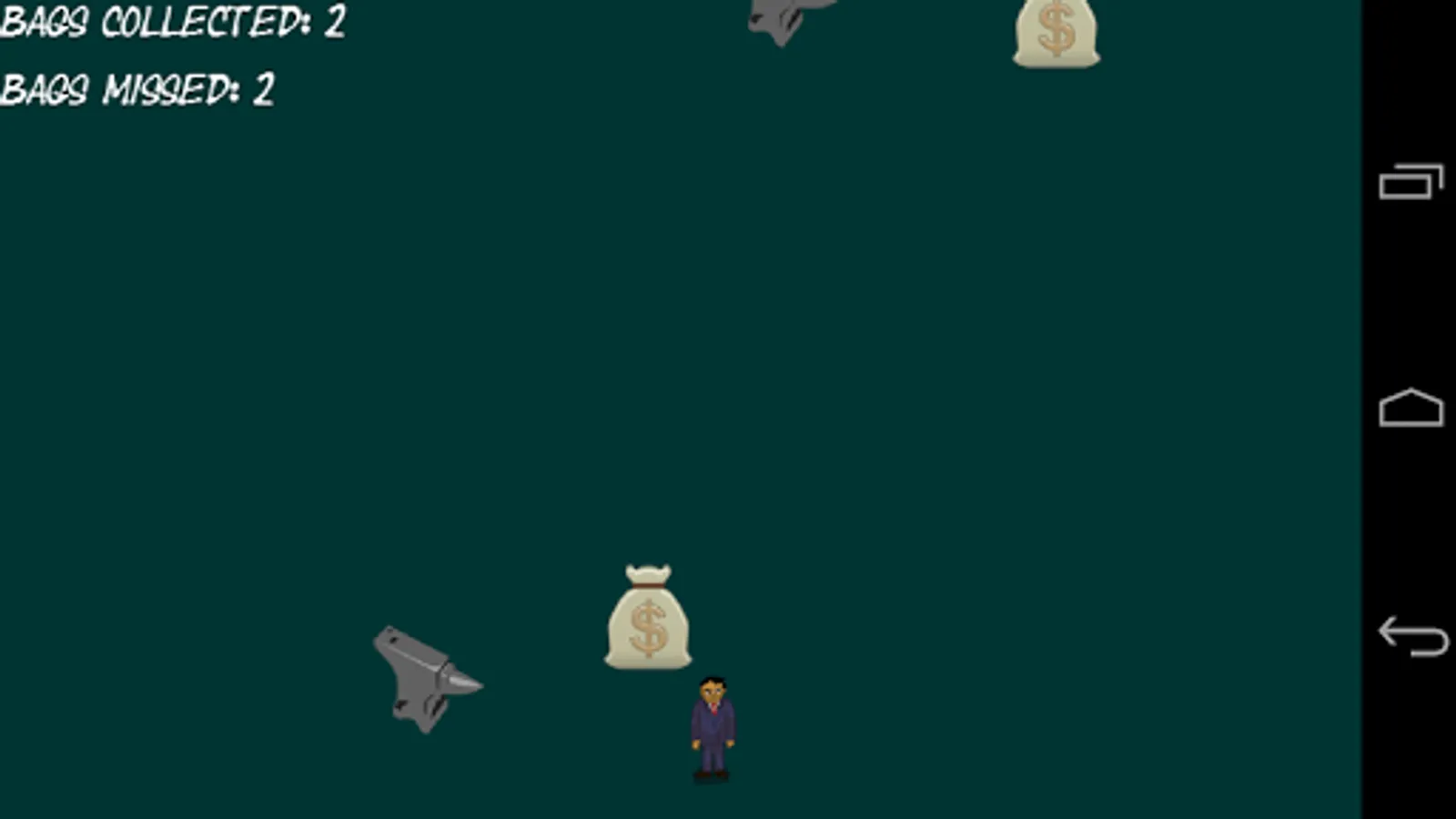 Collecting the bags of money as they fall, and avoid the Anvils.