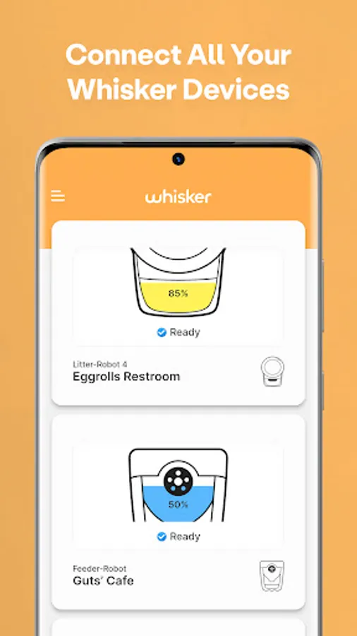 The Whisker Connect™ app allows you to remotely monitor and control your WiFi-enabled Litter-Robot unit(s) and Feeder-Robot unit(s) all in one place. This app brings you data about your cat’s litter box usage and your pet's feeding habits, giving you full control of your Litter-Robot 3 Connect and Feeder-Robot right from your phone.