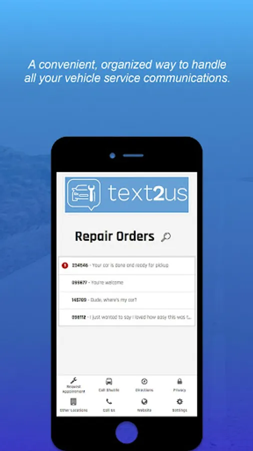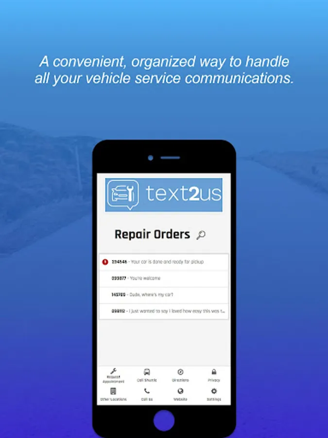 Download and use the Text2Us app on your smartphone. Never miss important information from your Service Advisor. Ask your Service Advisor questions or give authorization for your repair.