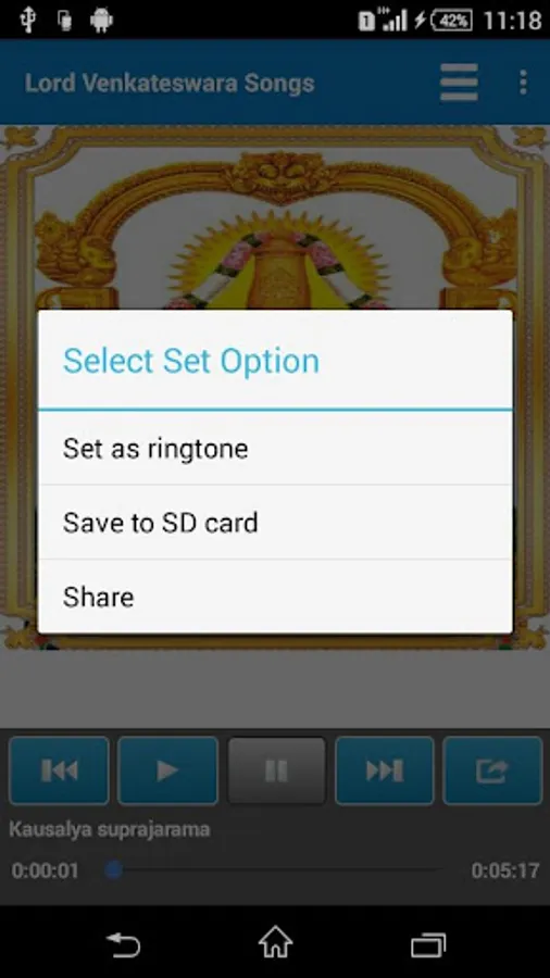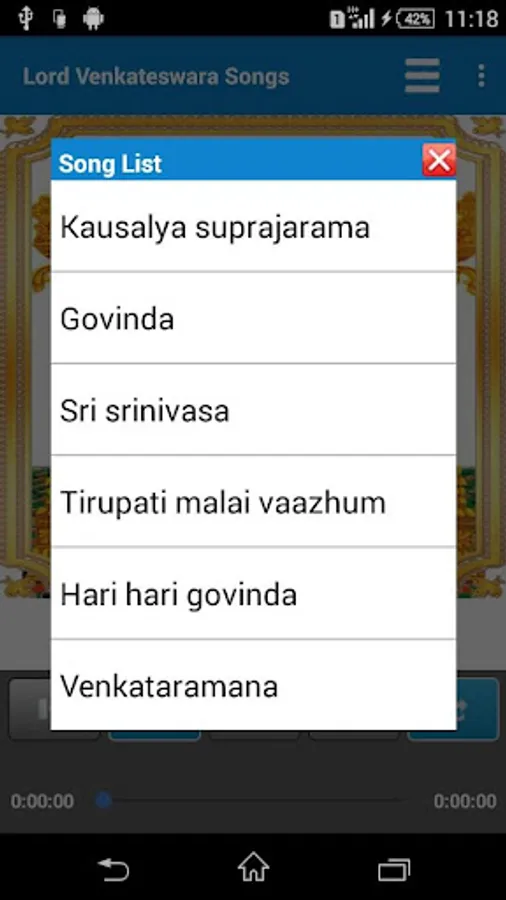 Lord Venkateswara devotional tamil songs with play, pause, next, previous, select song features.