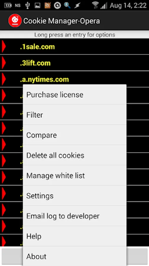* Manage the white/black list of host domain names. Long press a host domain name to remove it from the list. From the menu here, you can clear the entire list & specify if the list is used as a white (default) or black list. When a white list is used, cookies for the domain names in the list are "protected" from deletion during a delete all operation while all others are removed. When a black list is used, only cookies for the domain names listed will be removed during a delete all operation while all others are "protected".