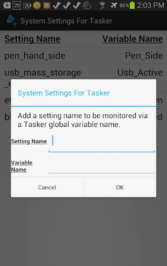 On the SSFT main page, choose Add from the menu. Enter bluetooth_on for name and my_bluetooth_on for nickname. Press OK. The resulting entry in the list means that SSFT will monitor for changes to the data for the setting bluetooth_on and will notify Tasker when its value changes.