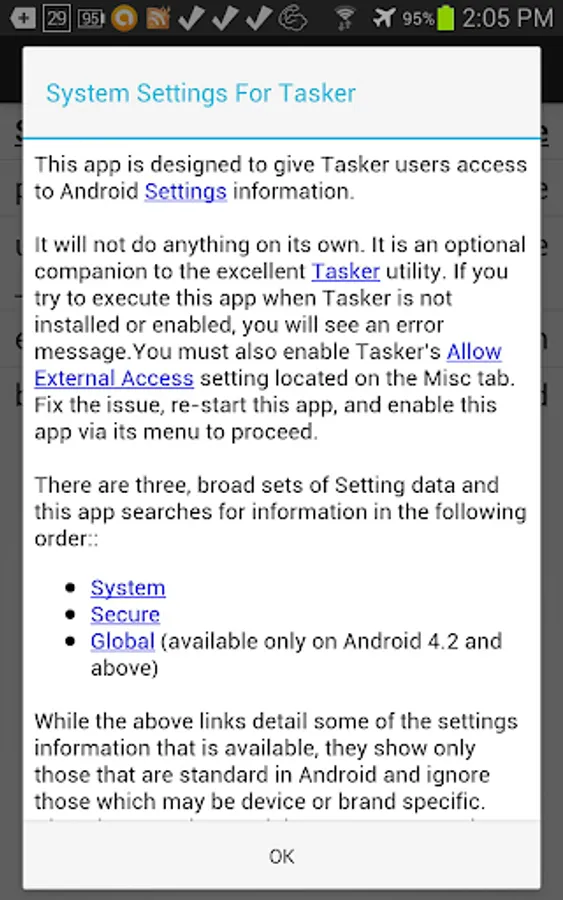 SSFT gives Tasker users access to Android Settings information but does not enable the changing of Android settings.