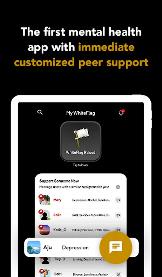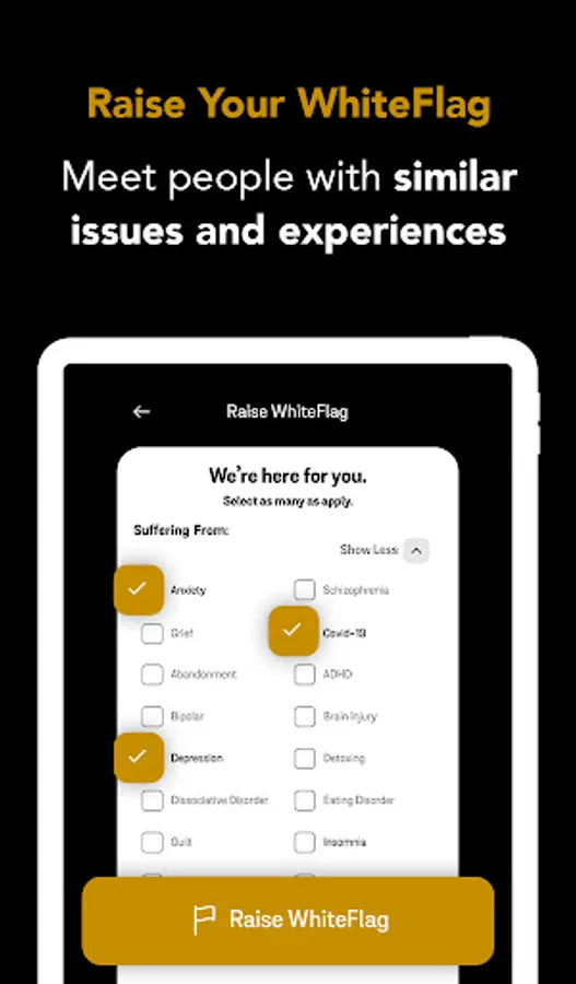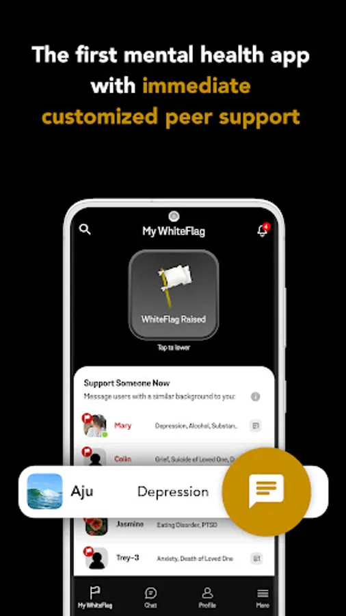 Embark on your journey of healing and getting a healthy mind today by selecting the specific challenges you are currently facing, such as depression, substance abuse, loneliness, or the grief of losing a loved one to suicide and freely and anonymously connect to other people. Once you've chosen the filters that align with your experiences, simply Raise your WhiteFlag, and receive immediate support from individuals who truly understand your struggles while being in a safe space.