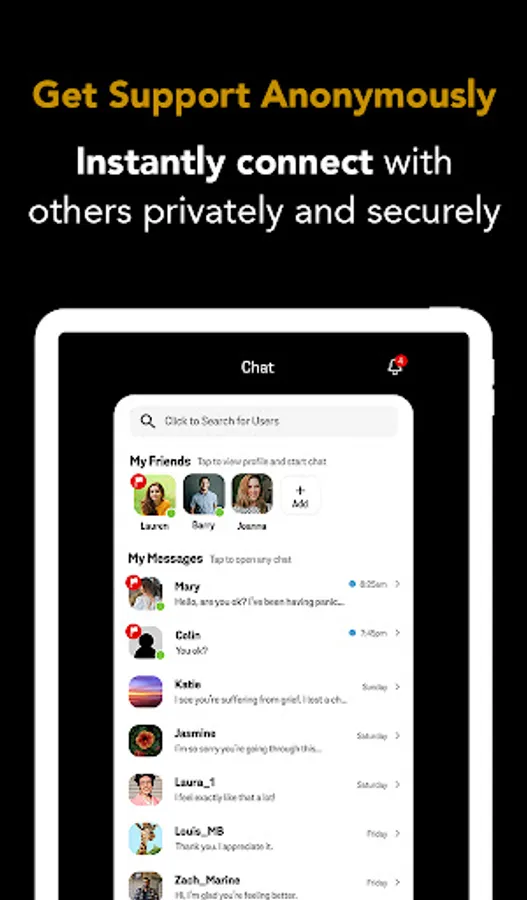 • Support: Helping people or receiving help is easy, anonymously, and free of charge to achieve a healthy mind.
