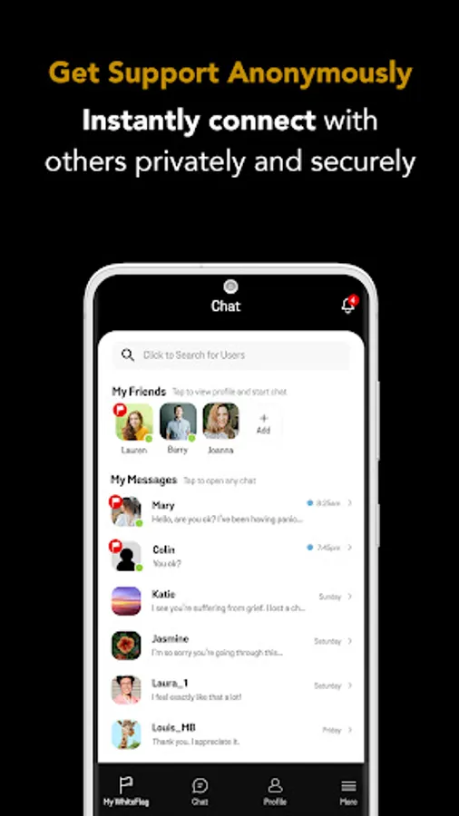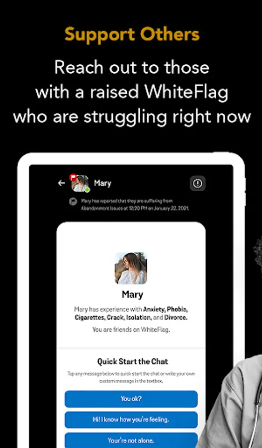 Remember, you are never alone! With peer support, whether you are giving support or getting support, WhiteFlag allows a safe, free, space to allow you to heal.