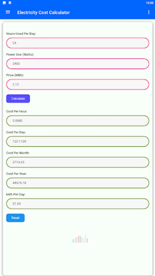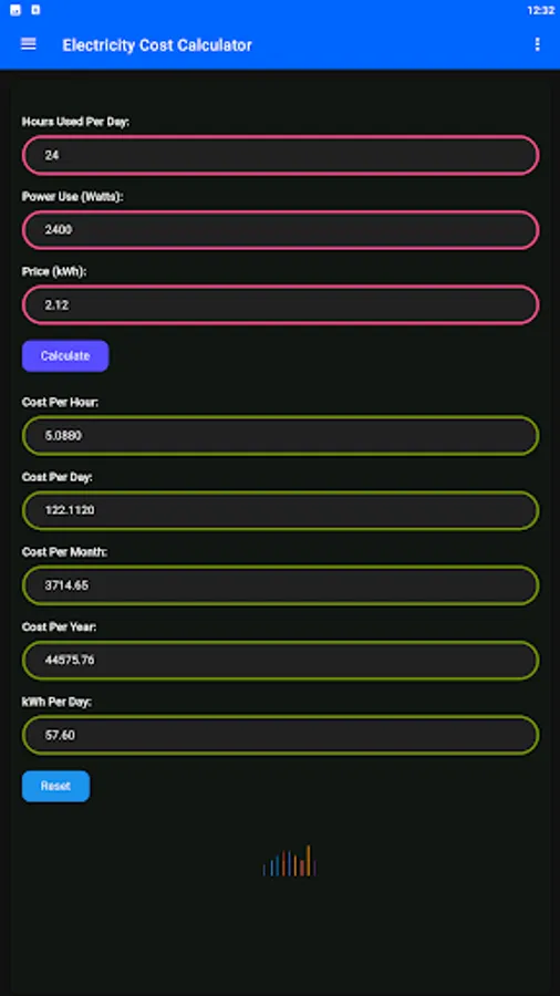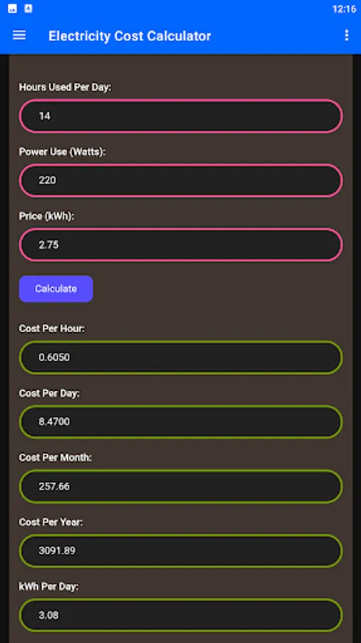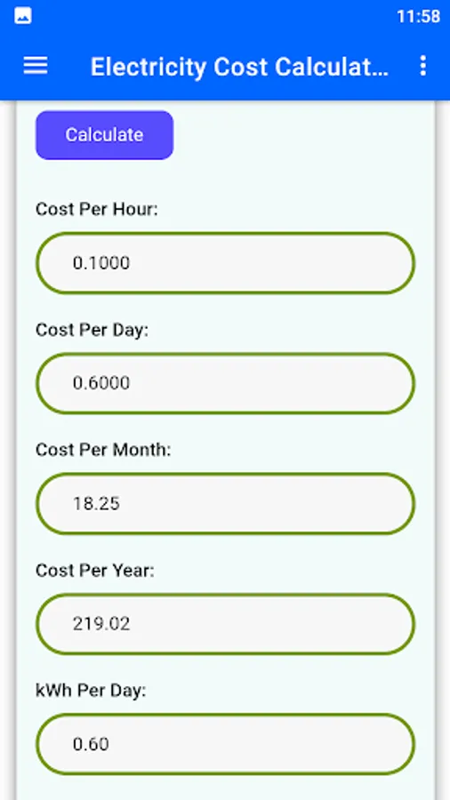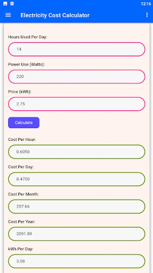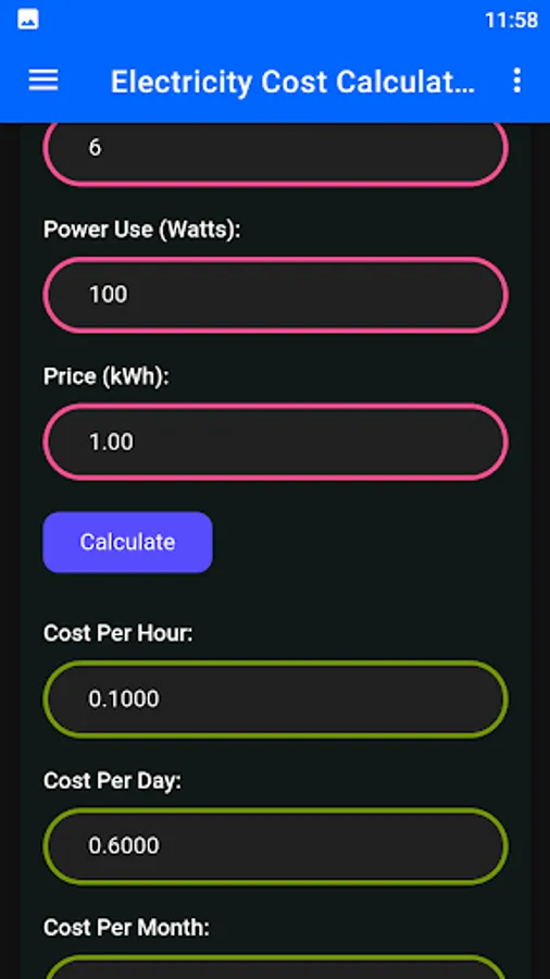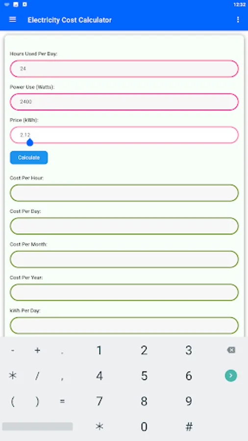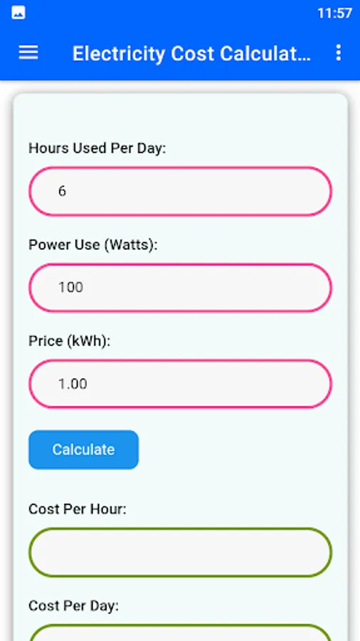 This App calculates the cost of electricity in running electrical appliances and equipment. Just enter the following information:
