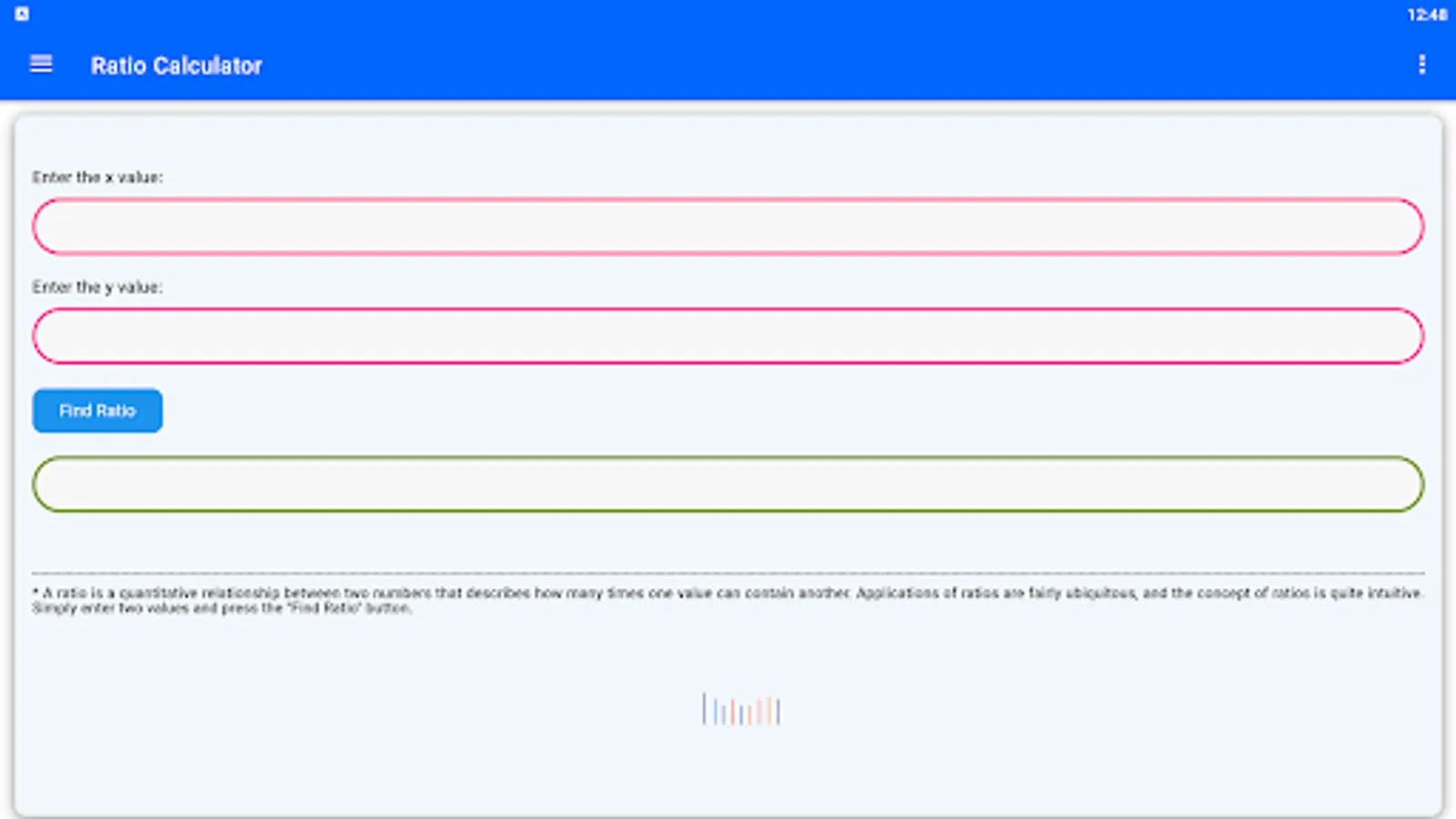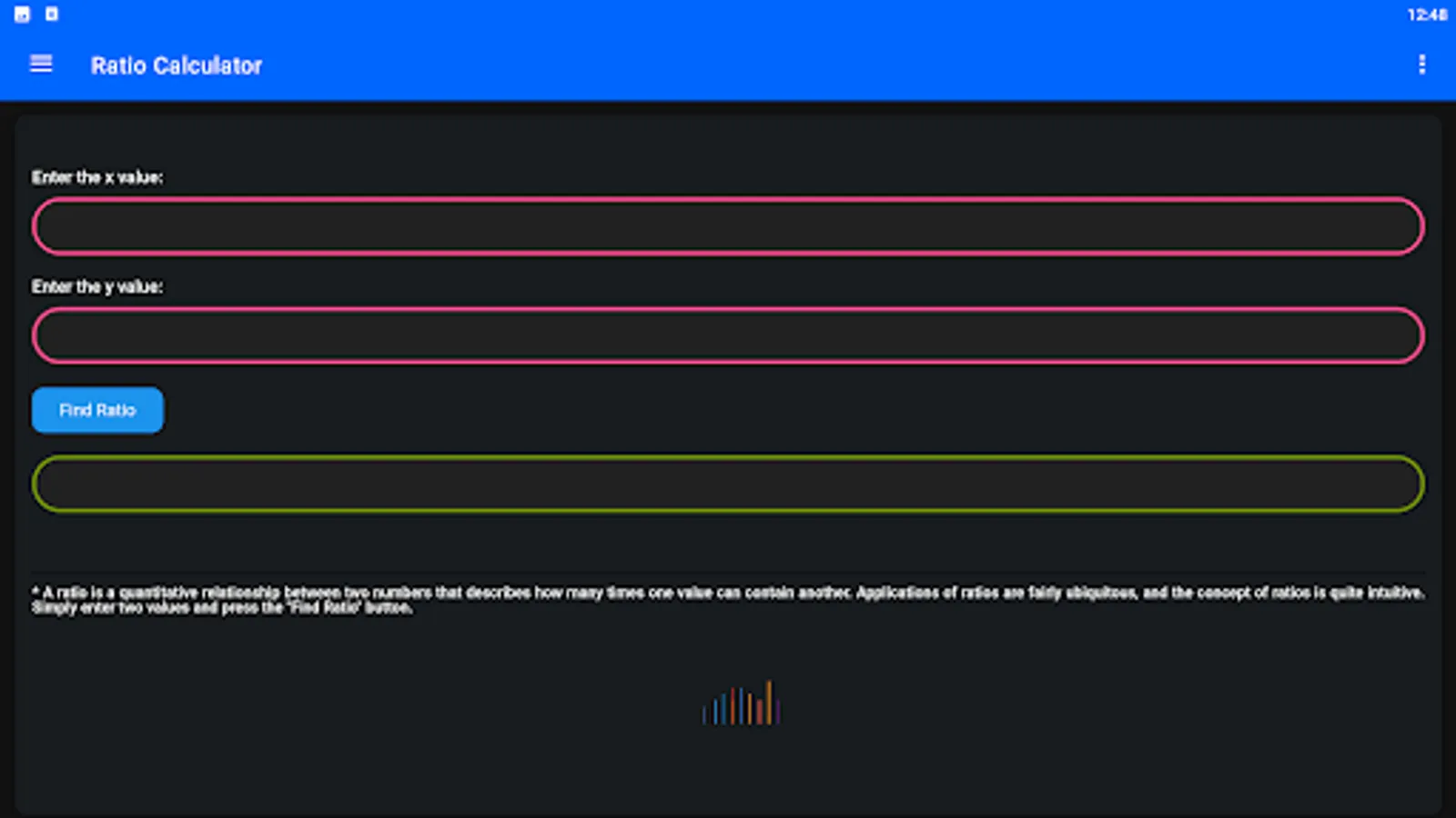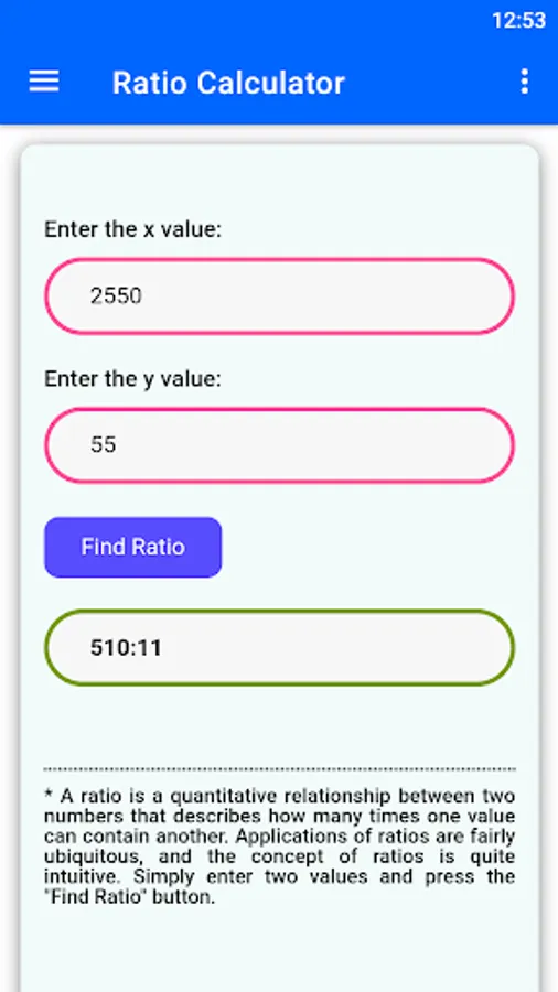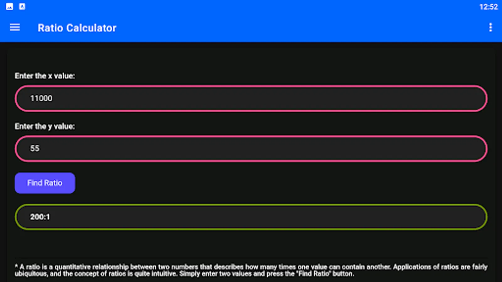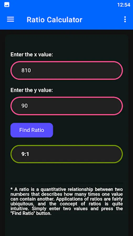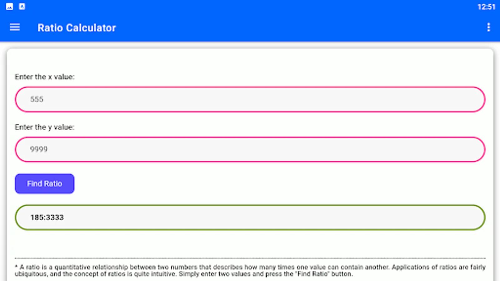 This app helps you to find out ratio within seconds. Simply enter two values and press the "Find Ratio" button