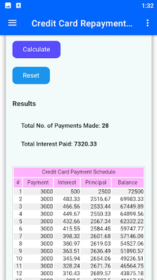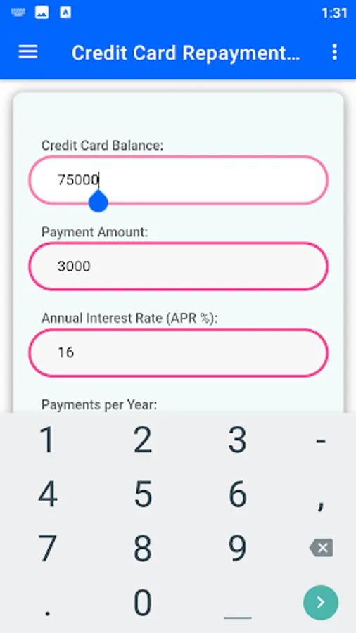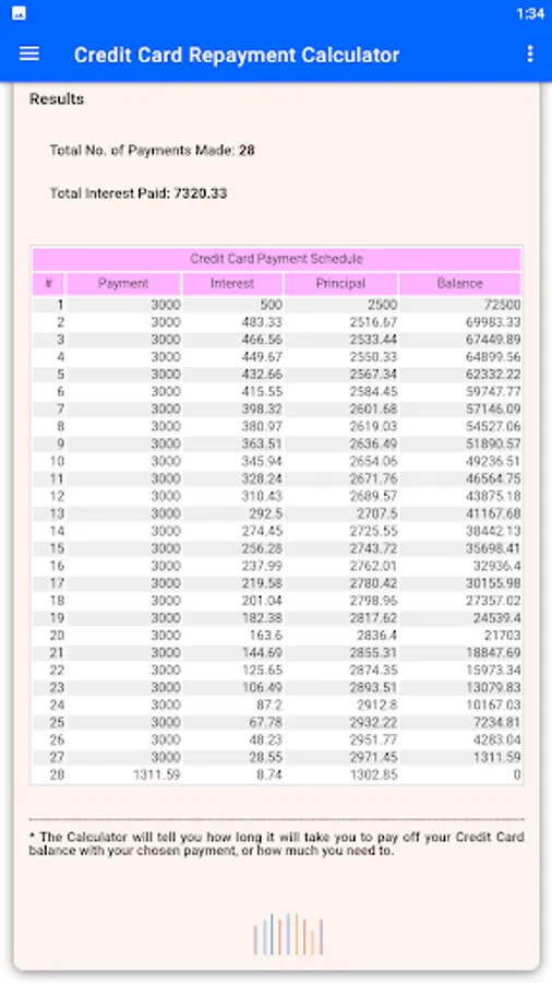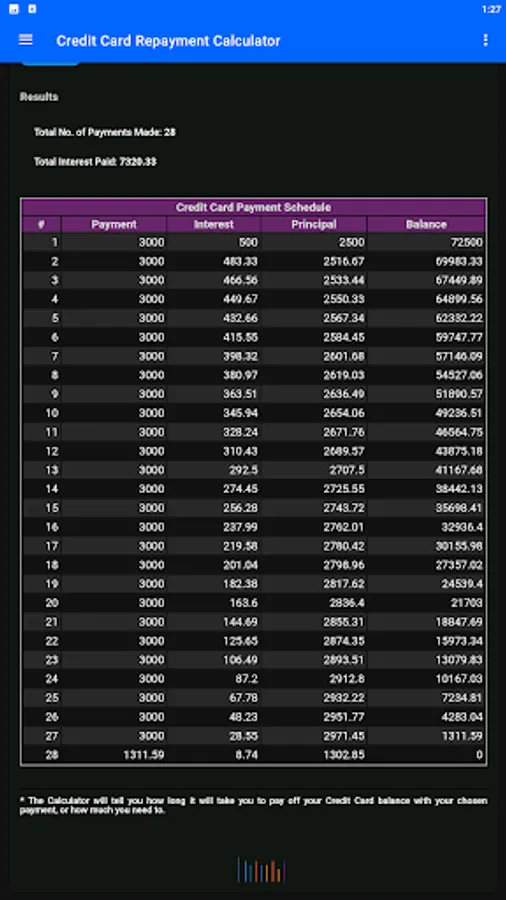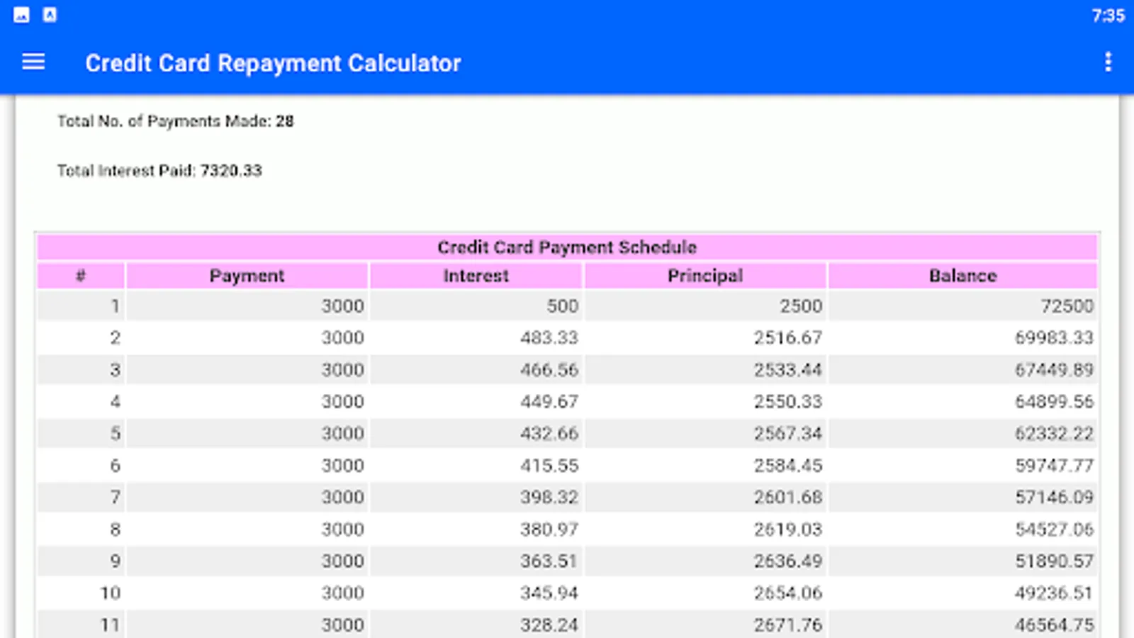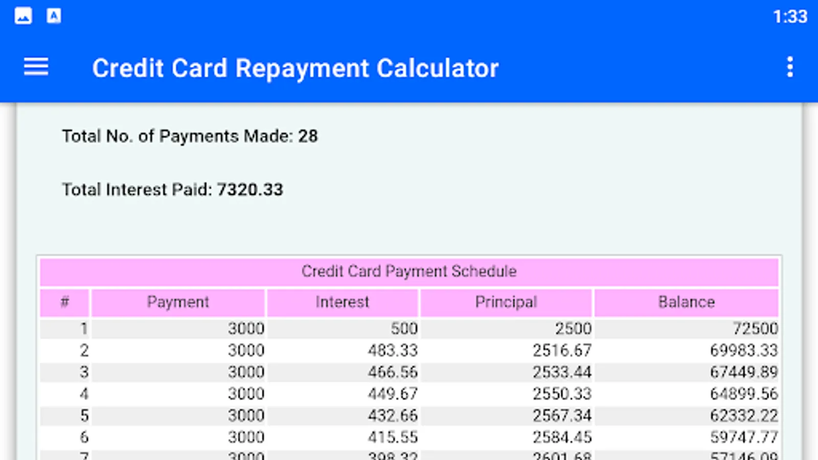 The app will tell you how long it will take you to pay off your Credit Card balance with your chosen payment, or how much you need to