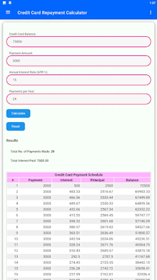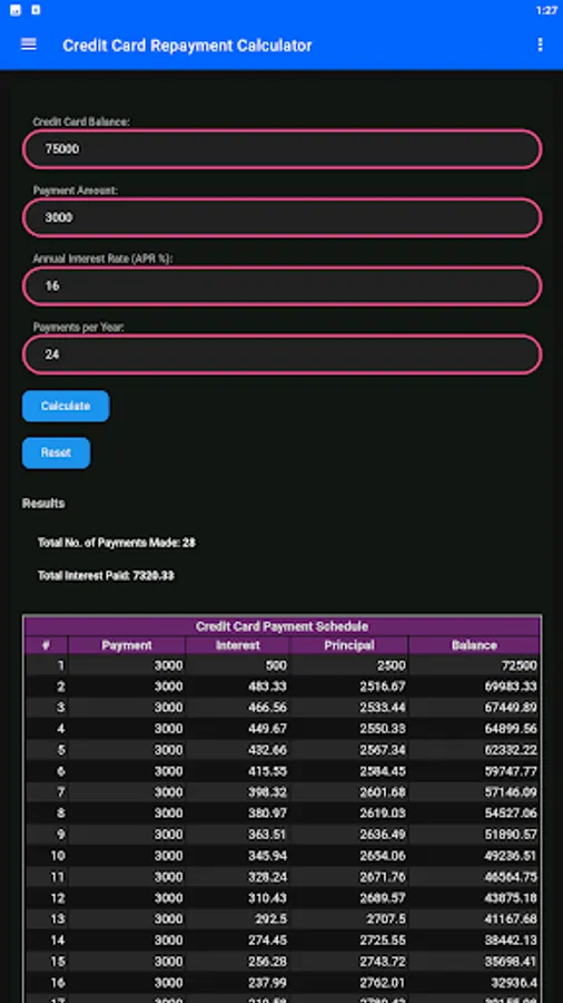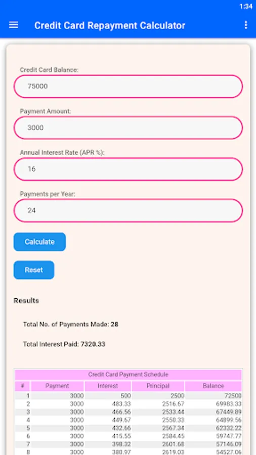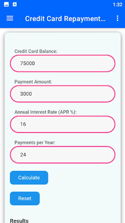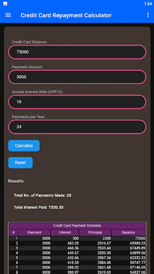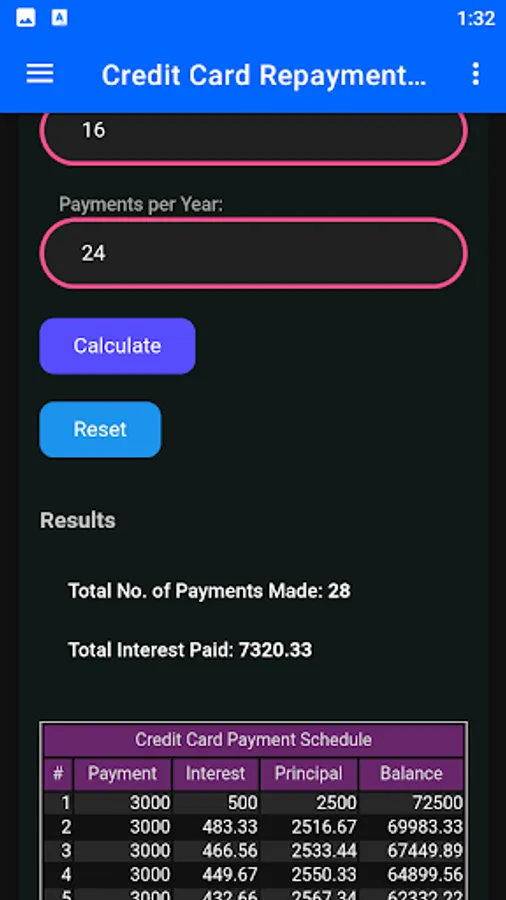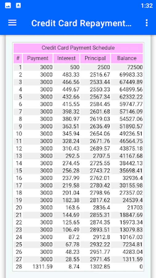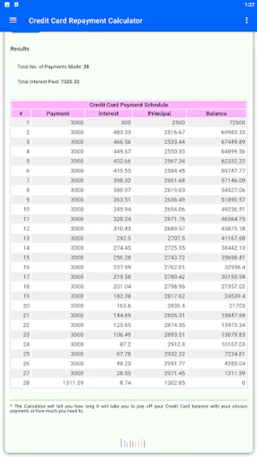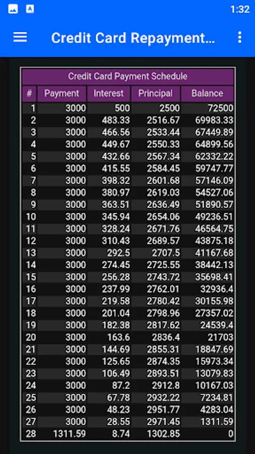 The app will tell you how long it will take you to pay off your Credit Card balance with your chosen payment, or how much you need to