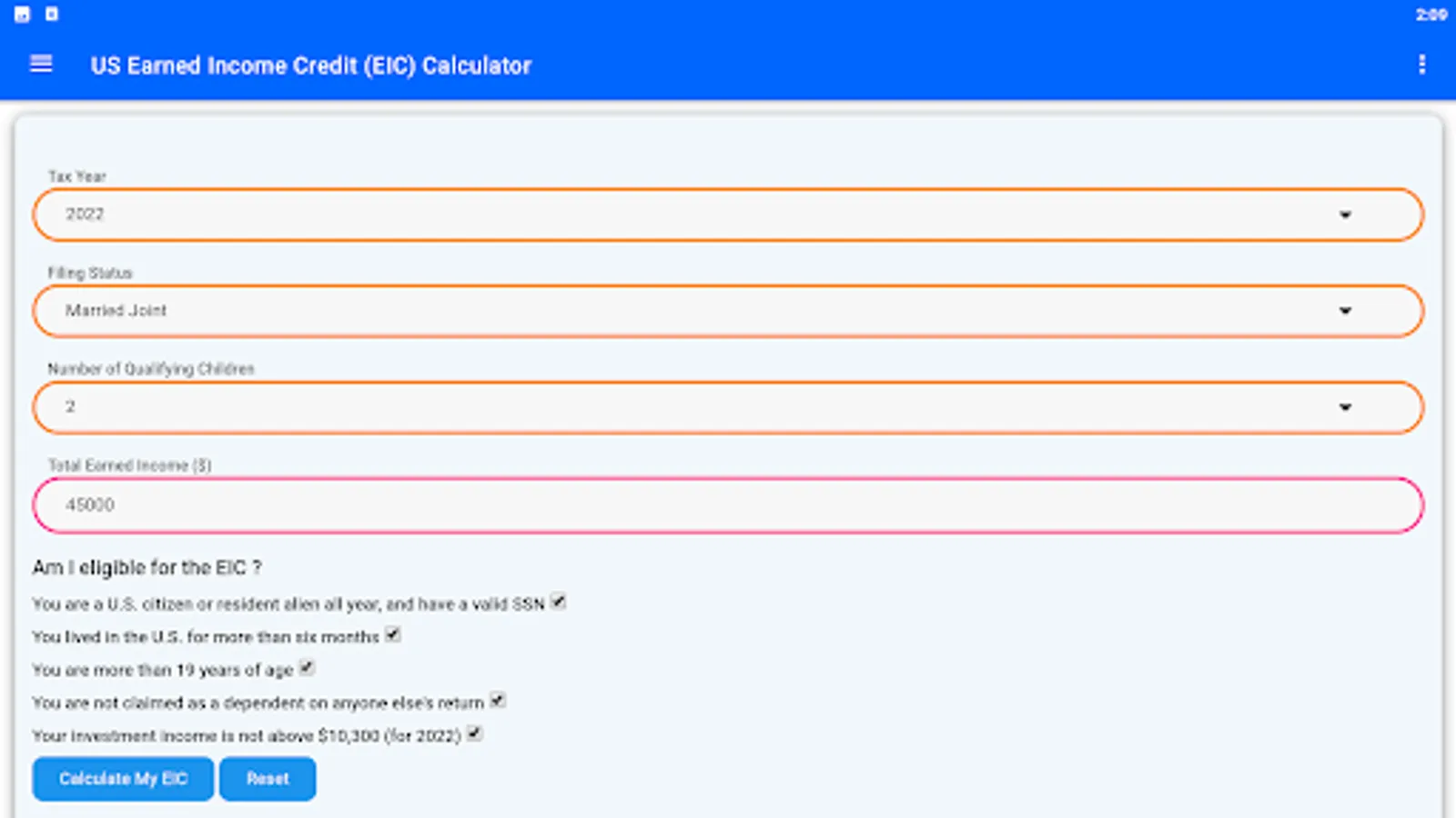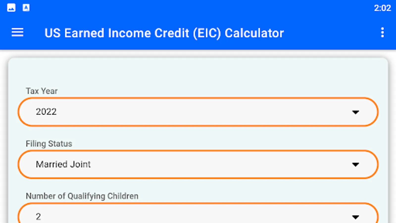 This is a refundable tax credit available for working individuals with low to moderate incomes. The EIC reduces the amount of taxes owed and may also give a refund. You can use this EIC Calculator to calculate your EIC based on the number of qualifying children, total earned income, and filing status.