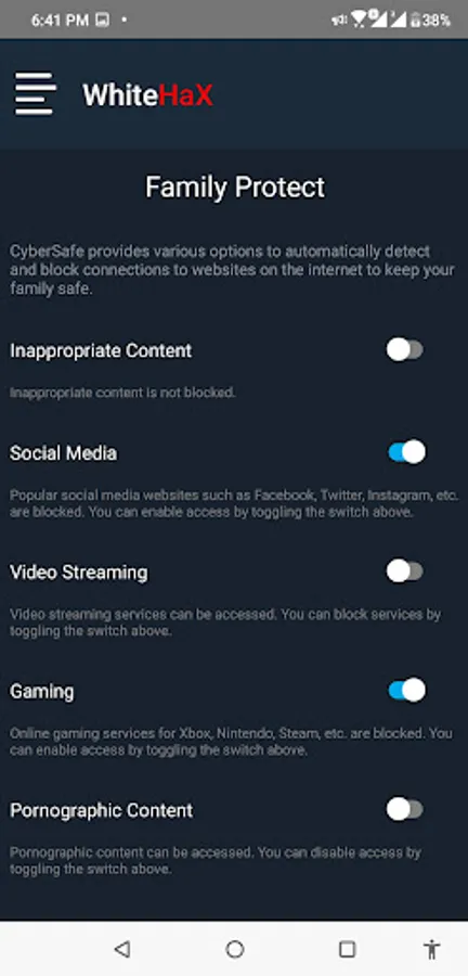 2. VPNService API: CyberSafe uses Android's VPNService to route traffic to itself, so it can be filtered on-device instead of on a server. No information is collected/stored. The VPN forwards traffic of allowed connections directly to its destination and does not use a remote VPN server.