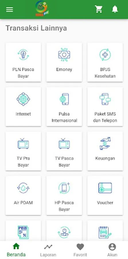 Contains POSTPAID PAYMENT icons, such as: PLN, PDAM, Telkom, BPJS, State Gas, Internet Billing, Credit Billing, etc.