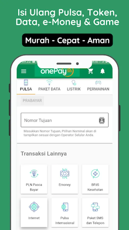 onePay is a digital application that serves the purchase of Cheap Credit, Data Packages, Tokens, Postpaid Electricity, and multi bill payments throughout Indonesia. And you also make inter-bank transfers with low admin fees.