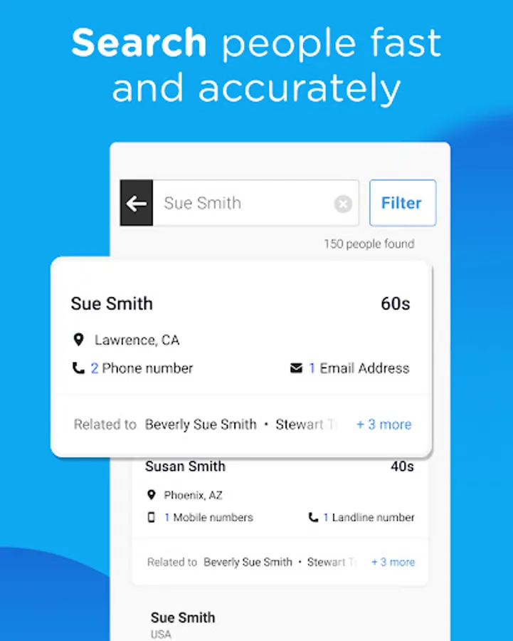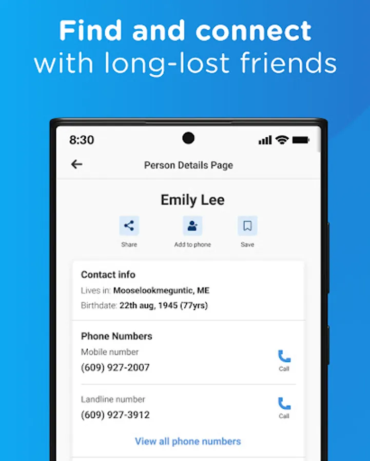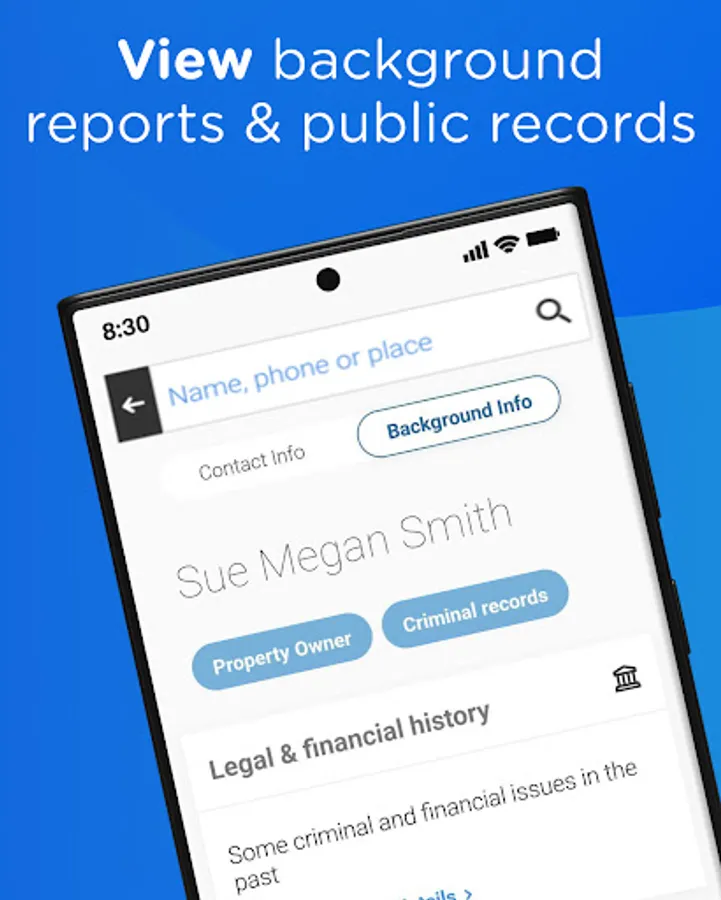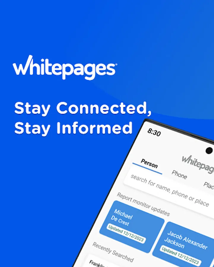 Get accurate and up-to-date contact information or learn more about a person's background in seconds through Whitepages Find People app, the most trusted online directory & reverse lookup service! With WhitePages Find People, you can quickly find information about people you may have lost contact with, verify the identity of a business contact, or look up an unknown caller. Our app provides users with quick and easy access to contact information and background details, including a person's name, address, phone number, email address, caller ID, property & criminal records, and other hard-to-find information.