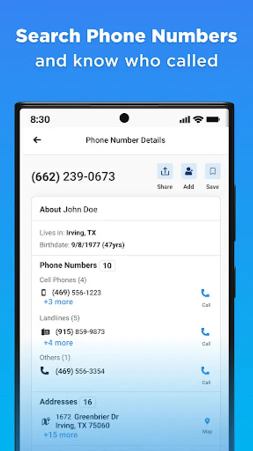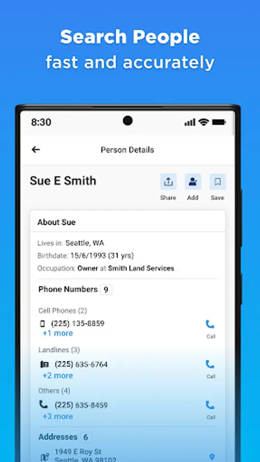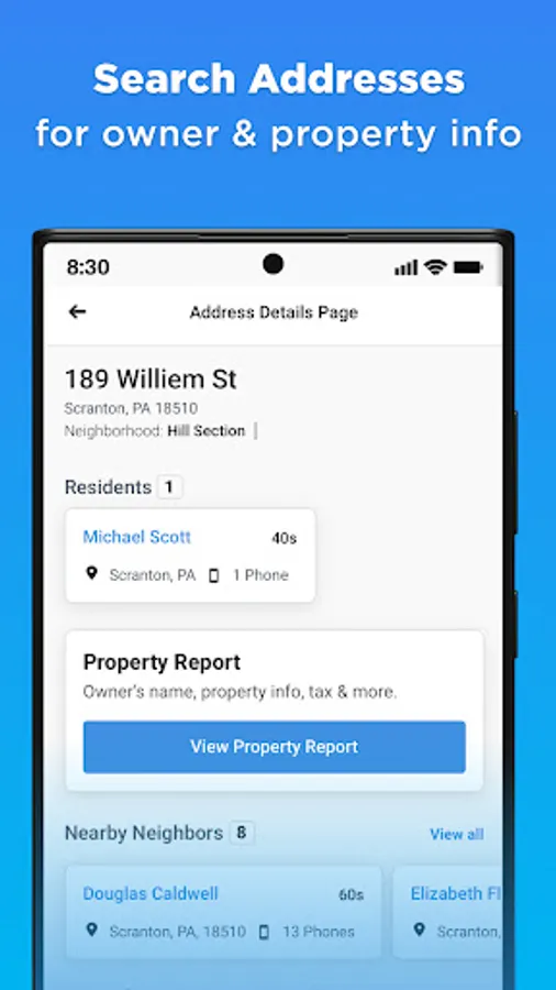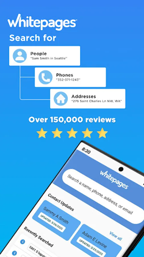 Get accurate contact details and background info with Whitepages Find People, the trusted phone book and reverse lookup app! Use people search to find lost contacts, phone number lookup to identify unknown callers, or free address lookup to find property owners. With Whitepages Find People, you can perform people searches to get phone numbers, addresses, emails, background reports and more. You can also effortlessly sync and clean your contacts to make sure they are always up-to-date. Access info fast with Whitepages Find People – your go-to directory for true people search!