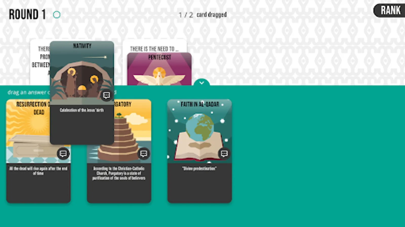 40 Answers is a didactic game aimed at teaching that all religions, although different from each other, share the common function of giving answers to the basic questions and needs of the individual and the community.