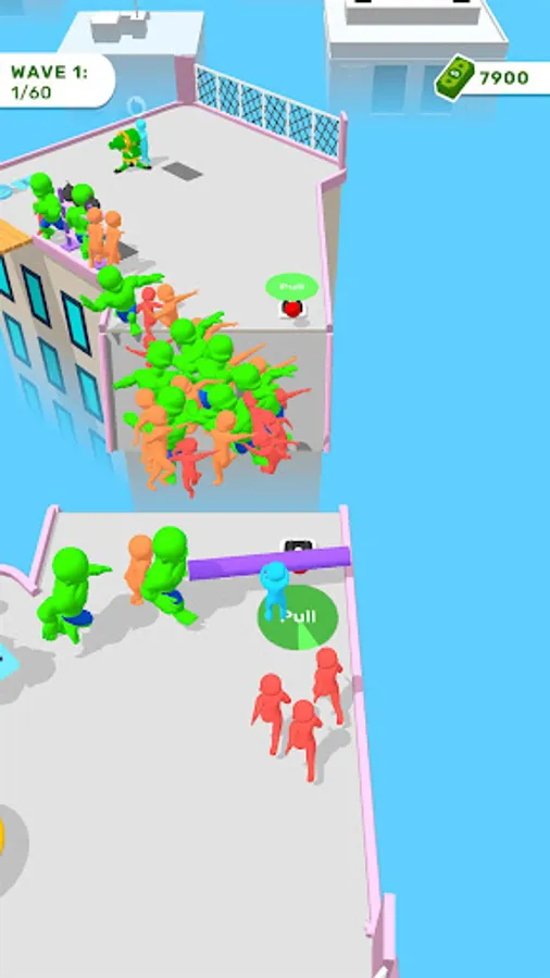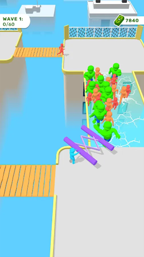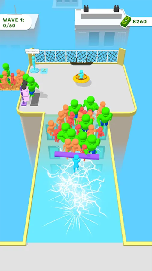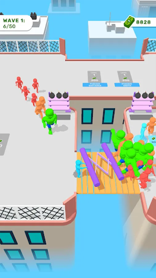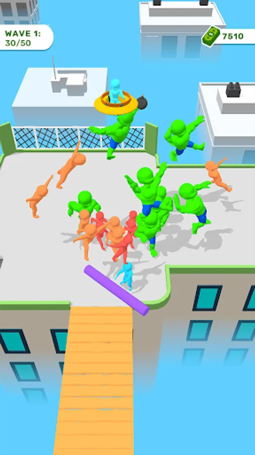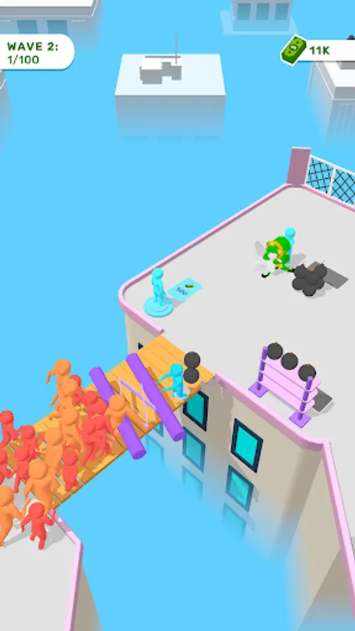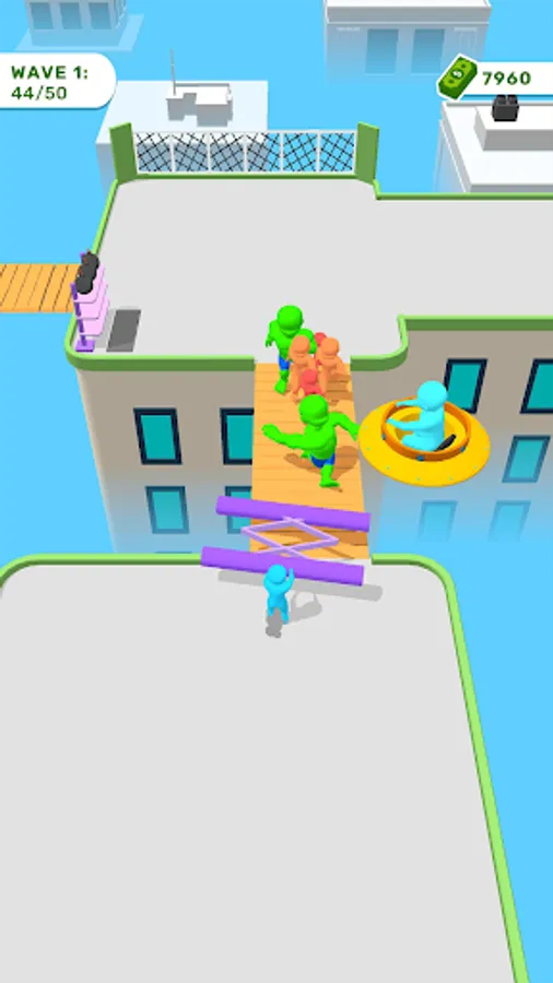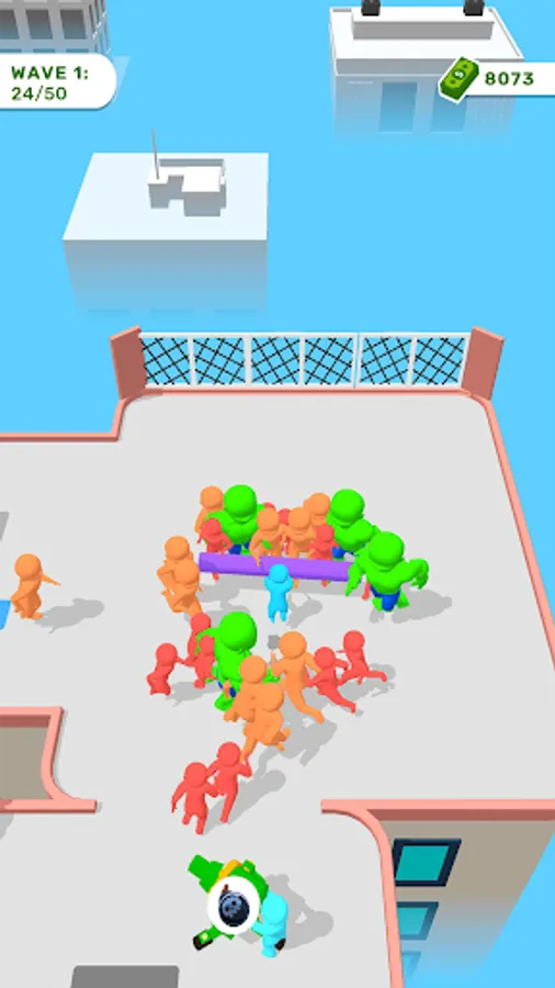 In Roof Defense, push the enemy wave to fall from the roof and clean everything up on your way.
