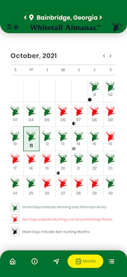 period should occur and where to hunt during that period. Green Days suggest stand placement