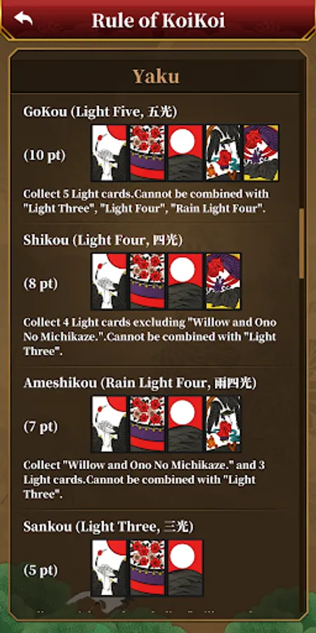 The object of the game is to form special card combinations called "yaku" from cards accumulated in a point pile. Players can gain cards in their point piles by matching cards in their hands, or drawn from the draw pile, with cards on the table. Once a yaku has been made, a player can stop to cash in points, or keep going (referred to as "koi-koi", hence the name of the game) to form additional yaku for more points. The point values assigned to individual cards have no effect on the score, but they are helpful to judge their value in forming yaku.