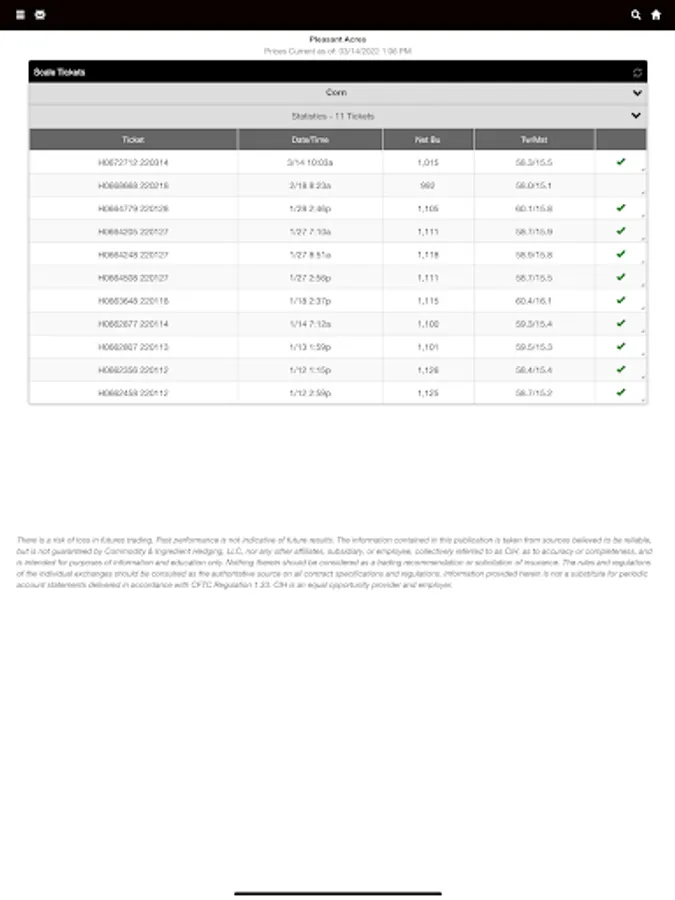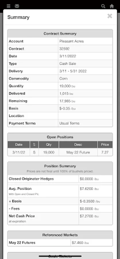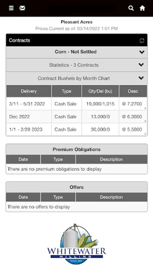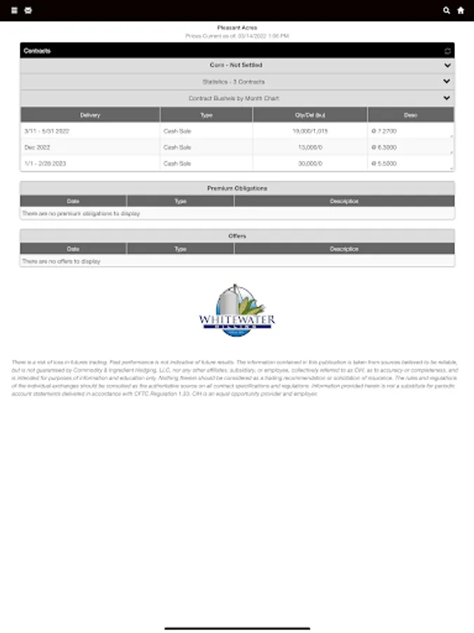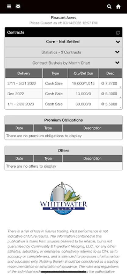 See local cash bids, current CBOT prices, grower contracts and offers, marketing strategies. Available to download and use with Whitewater Milling programs.