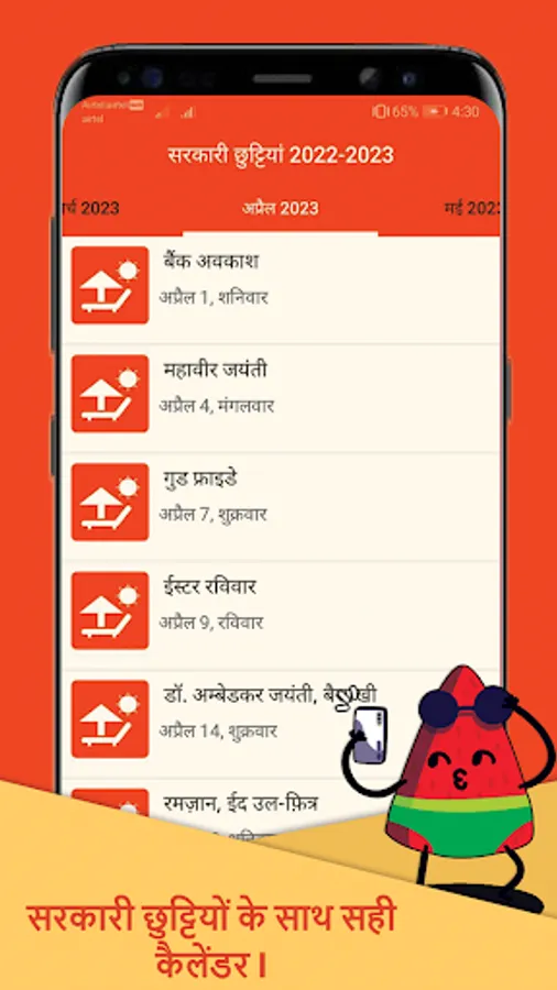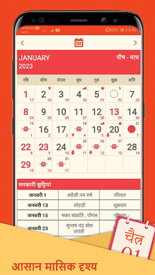 2023 के हिंदी कैलेंडर एप्लिकेशन में सभी महीनों की कैलेंडर छवि होती है।
