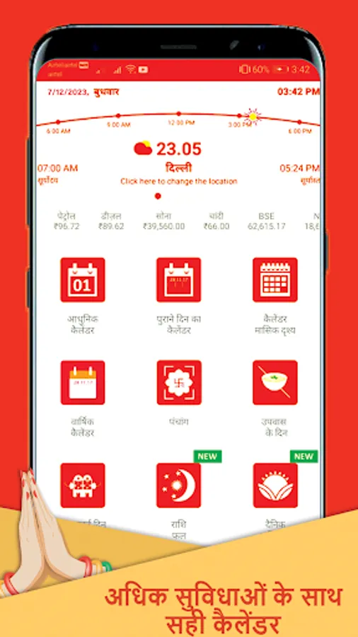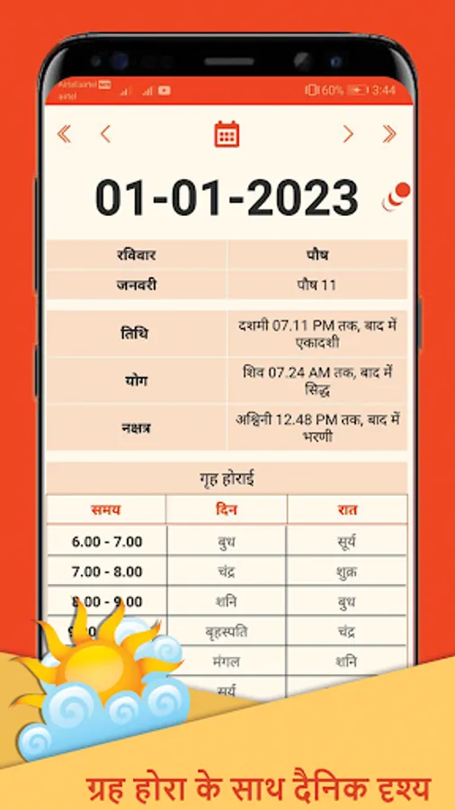 हिंदी पंचांग (तिथि, महीना, दिन, तीथि, नक्षत्र, रासी, योग, सुभ मुहूर्त दिन, ग्रह प्रवेश मुहूर्त, मुख्य दिन की जानकारी आवेदन में है