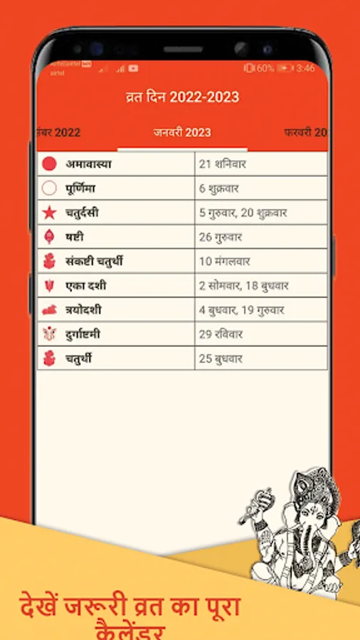 एप्लिकेशन सभी हिंदी त्योहारों, छुट्टियों, हिंदी उपवास के दिनों की पेशकश करता है)