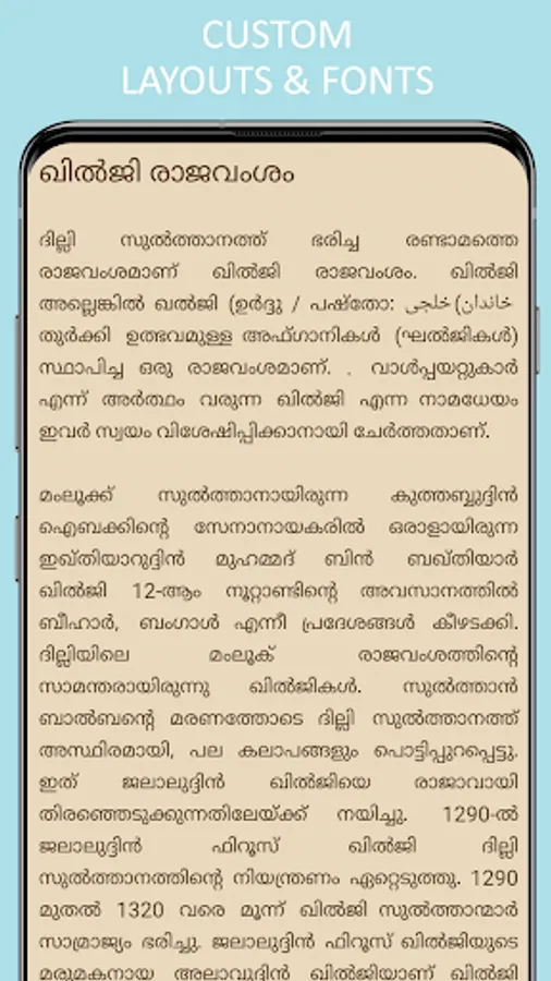 Here is our first app on Malayalam language, and we are very proud to present our great beloved nation's history on your android devices especially in Malayalam. This app, India History, is in Malayalam language for everyone to read, literate and improve their historical knowledge.