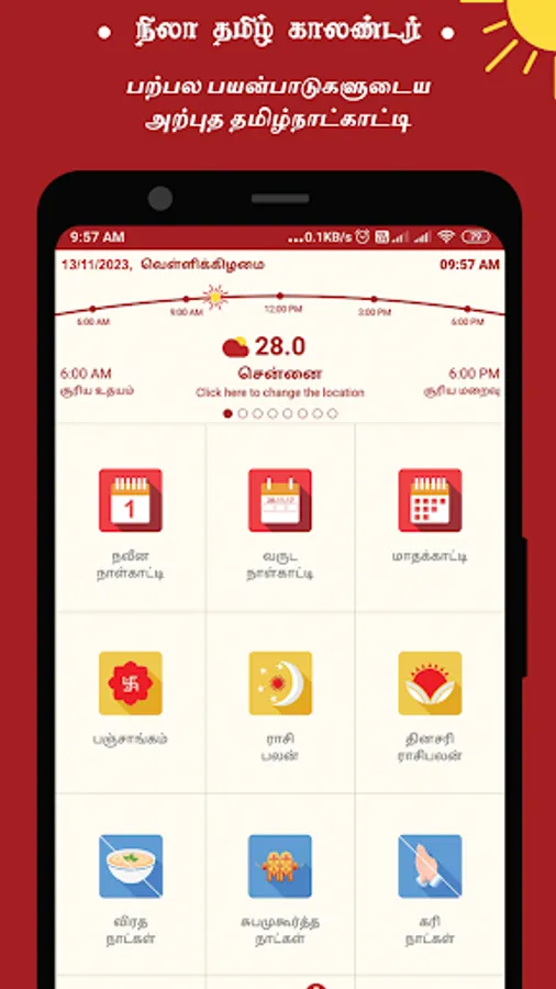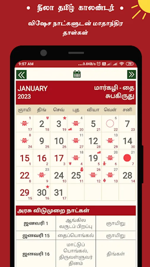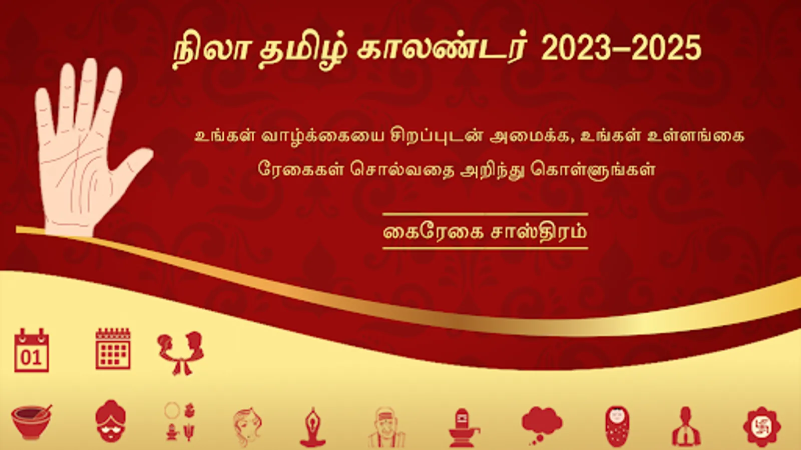 We have included both modern & classic layouts for both the younger Tamil generation and classic & contemporary liking people. The daily sheet in the 'Nila Tamil Calendar 2023' app covers Tamil Dates (Day, Month & Year in Tamil Thiruvalluvar Calendar Years), Muslim Dates, Daily Rasi Palan for 12 horoscope stars, Panchangam info, and the Hindu auspicious specialty.