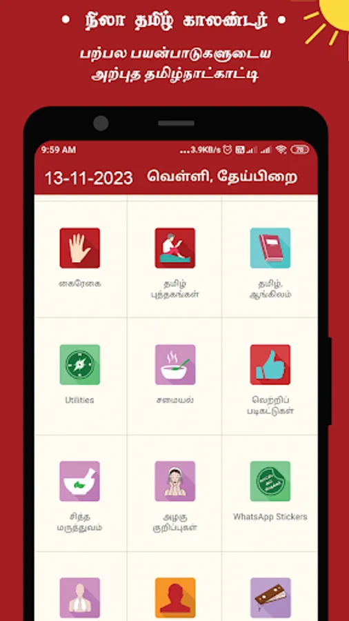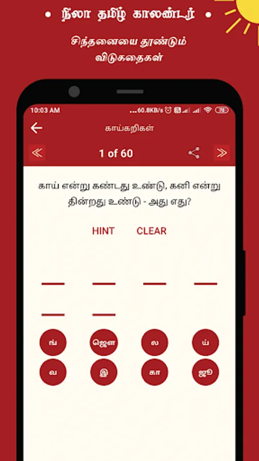 We have collected more than 1000 riddles in Tamil to exercise your brain. Yes, with this 'Nila Tamil Calendar 2023' app, you can solve 100s of riddles and challenge your friends by sharing with them.