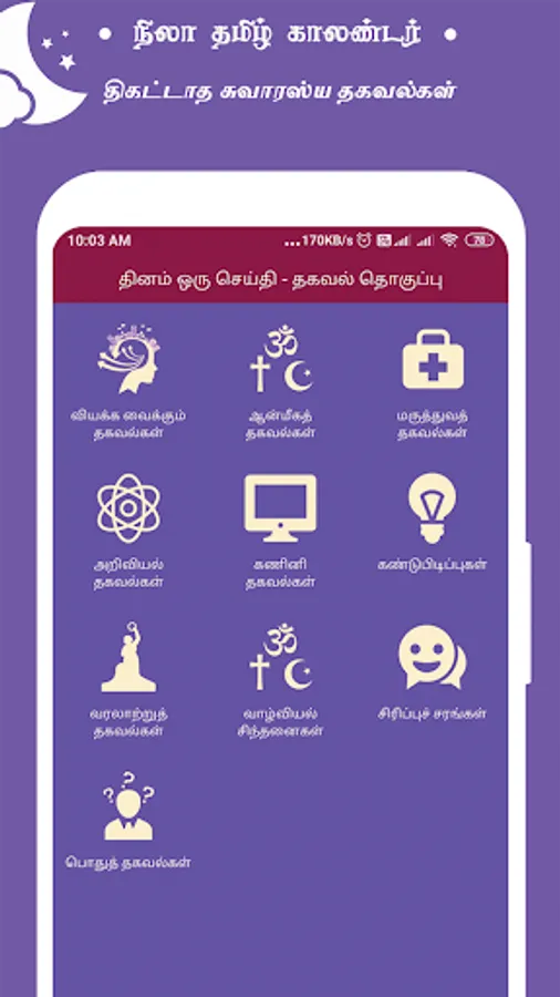 We are the first one to introduce several features in a Tamil Calendar App. To name few, Numerology, Marriage Matching, Shiva Temples, Book Store, Siddha Medicine, Beauty Tips for girls & boys, names for newborns as per stars and classic calendar layouts.