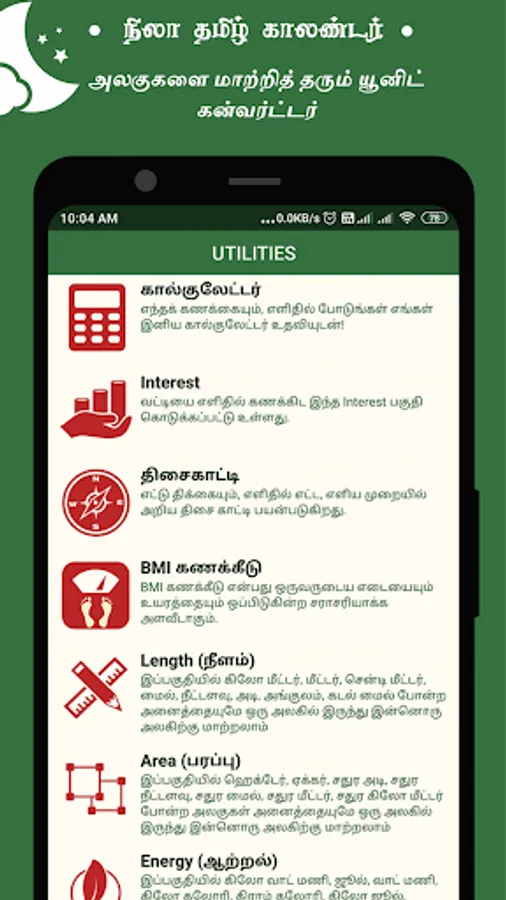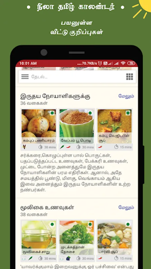 We have brought more than 500 Tamil recipes to our users with this 'Tamil Calendar' app. The app will provide complete information for preparing recipes daily.