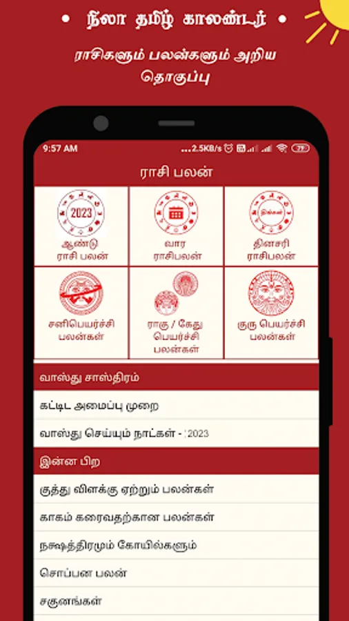 The 'Tamil Calendar 2023' app provides Guru Peyarchi 2021 to 2025 Palangal and 2023 Year general Palangal info. This info was predicted by one of the finest horoscope experts. The expert's contact detail is given to reach for any clarifications.