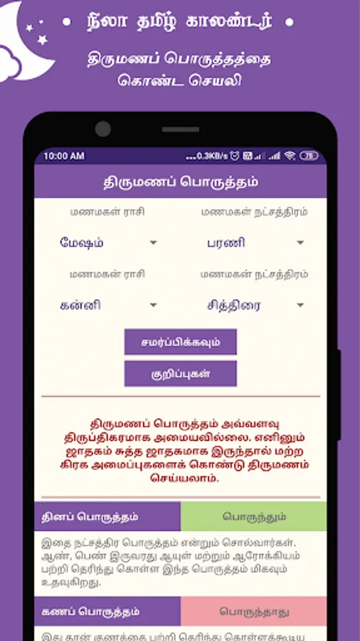 We have given this as part of the 'Nila Tamil Calendar 2023' app. Give Rasi & Natchathiram details and find out all the 10 matching aspects in the marriage matching process.